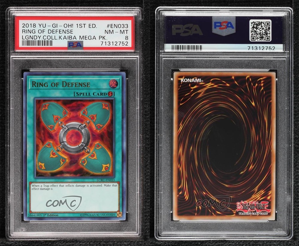 2018 Yu-Gi-Oh! - Legendary Collection Kaiba - [Base] - 1st Edition #LCKC-EN033 Ultra Rare - Ring of Defense Graded PSA 8 NM-MT COMC Item: 172170099 - YuGiOh Card - Featuring Ring of Defense Search for more: 2018 Yu-Gi-Oh! - Legendary Collection Kaiba Search for more: 2018 Yu-Gi-Oh! - Legendary Collection Kaiba - [Base] - 1st Edition View all of our Listings Auctions Buy It Now About Us Located in the beautiful Pacific Northwest, COMC (Check Out My Cards) is the world's largest consignment service for trading card singles. More than 10,000 people have used our consignment service to list over 50 million trading cards. Find out how we can help you consign your items on eBay by contacting us through eBay messaging. COMC -- "The Safe & Easy Way to Buy & Sell" Raw Condition for Modern Cards Unless otherwise noted, raw modern cards are listed in Near Mint-Mint condition or better. A NM-MT card appears to be Mint at first glance, but upon closer inspection, may exhibit some of the following: minor print defects (e.g. roller marks, print line, dimple), minor scratches, slight edge wear, and slight corner wear. Centering is clearly visible in the images provided and does not factor into our condition assessment. Raw Condition for Vintage Cards Unless otherwise noted, raw vintage cards are listed in Excellent condition or better. An EX card may exhibit some of the following: minor rounding of corners, surface wear, print defects, light scratches, and slight edge wear/chipping. Centering is clearly visible in the images provided and does not factor into our condition assessment. Domestic Shipping Combined shipping for multiple items is available. To receive combined shipping, please ensure all desired items are in your eBay shopping cart before proceeding to checkout. eBay limits orders to 40 items per order. We automatically combine multiple orders placed on the same day. If you place multiple orders on the same day, please contact us to request a refund of applicable shipping costs. Signature confirmation may be required on invoices over $400. All cards are protected and shipped securely. International Shipping COMC offers eBay's International Shipping (EIS) for international orders under $2,500* (see country exceptions below). All duties and import fees are paid at checkout; in the rare event that there are additional import fees upon delivery, these are borne by the buyer. EIS packages route through a shipping hub in Erlanger, KY before shipping to their final destination. Please note that EIS does not allow for combined shipments. The shipping rates are determined by eBay and cannot be adjusted. *Maximum sale price exceptions: Colombia, Kuwait ($2,000); Taiwan ($1,539); Chile, Costa Rica, Guatemala, Honduras, Trinidad and Tobago ($1,000); Antigua and Barbuda, Aruba, Belize, Dominica, Grenada, Philippines, Saint Kitts and Nevis, Saint Lucia, Montserrat, Turks and Caicos Islands ($500); Dominican Republic, El Salvador ($200). Please request a shipping quote through eBay messaging for orders that exceed the maximum sale price supported by eBay's International Shipping. You will be responsible for all duties and import fees for international orders shipped outside the EIS. All cards are protected and shipped securely. Payment COMC does not accept offers on our cards through our eBay storefront. COMC utilizes eBay’s managed payments system. If you are experiencing difficulties making a payment, please contact eBay for assistance. Return Policy Returns are only accepted on the rare occasion the item is not as described. If you are making a return, please initiate the return process through eBay so a mailing label can be provided for you. Prior to listing, our expert team carefully assessed this item to represent it accurately. Please review the description and high-definition images prior to purchasing to ensure this item meets your satisfaction. We welcome you to contact us if you have further questions about this item. Trust and Integrity COMC carefully assesses each item consigned to us to prevent fraudulent items from entering the marketplace. If you believe an item offered on COMC may be fraudulent, please contact us with details so we can investigate the issue. Items we determine are outside our supported items policy may be removed. Last Modified: 6/7/2025 3:08:31 AM PDT