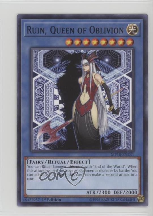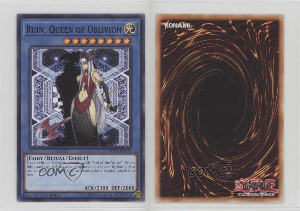 2018 Yu-Gi-Oh! Mega-Tins - Mega Pack [Base] - 1st Edition #MP18-EN231 Ruin, Queen of Oblivion COMC Item: 187365790 - YuGiOh Card - Featuring Ruin, Queen of Oblivion Search for more: 2018 Yu-Gi-Oh! Mega-Tins Search for more: 2018 Yu-Gi-Oh! Mega-Tins - Mega Pack [Base] - 1st Edition View all of our Listings Auctions Buy It Now About Us Located in the beautiful Pacific Northwest, COMC (Check Out My Cards) is the world's largest consignment service for trading card singles. More than 10,000 people have used our consignment service to list over 50 million trading cards. Find out how we can help you consign your items on eBay by contacting us through eBay messaging. COMC -- "The Safe & Easy Way to Buy & Sell" Raw Condition for Modern Cards Unless otherwise noted, raw modern cards are listed in Near Mint-Mint condition or better. A NM-MT card appears to be Mint at first glance, but upon closer inspection, may exhibit some of the following: minor print defects (e.g. roller marks, print line, dimple), minor scratches, slight edge wear, and slight corner wear. Centering is clearly visible in the images provided and does not factor into our condition assessment. Raw Condition for Vintage Cards Unless otherwise noted, raw vintage cards are listed in Excellent condition or better. An EX card may exhibit some of the following: minor rounding of corners, surface wear, print defects, light scratches, and slight edge wear/chipping. Centering is clearly visible in the images provided and does not factor into our condition assessment. Domestic Shipping Combined shipping for multiple items is available. To receive combined shipping, please ensure all desired items are in your eBay shopping cart before proceeding to checkout. eBay limits orders to 40 items per order. We automatically combine multiple orders placed on the same day. If you place multiple orders on the same day, please contact us to request a refund of applicable shipping costs. Signature confirmation may be required on invoices over $400. All cards are protected and shipped securely. International Shipping COMC offers eBay's International Shipping (EIS) for international orders under $2,500* (see country exceptions below). All duties and import fees are paid at checkout; in the rare event that there are additional import fees upon delivery, these are borne by the buyer. EIS packages route through a shipping hub in Erlanger, KY before shipping to their final destination. Please note that EIS does not allow for combined shipments. The shipping rates are determined by eBay and cannot be adjusted. *Maximum sale price exceptions: Colombia, Kuwait ($2,000); Taiwan ($1,539); Chile, Costa Rica, Guatemala, Honduras, Trinidad and Tobago ($1,000); Antigua and Barbuda, Aruba, Belize, Dominica, Grenada, Philippines, Saint Kitts and Nevis, Saint Lucia, Montserrat, Turks and Caicos Islands ($500); Dominican Republic, El Salvador ($200). Please request a shipping quote through eBay messaging for orders that exceed the maximum sale price supported by eBay's International Shipping. You will be responsible for all duties and import fees for international orders shipped outside the EIS. All cards are protected and shipped securely. Payment COMC does not accept offers on our cards through our eBay storefront. COMC utilizes eBay’s managed payments system. If you are experiencing difficulties making a payment, please contact eBay for assistance. Return Policy Returns are only accepted on the rare occasion the item is not as described. If you are making a return, please initiate the return process through eBay so a mailing label can be provided for you. Prior to listing, our expert team carefully assessed this item to represent it accurately. Please review the description and high-definition images prior to purchasing to ensure this item meets your satisfaction. We welcome you to contact us if you have further questions about this item. Trust and Integrity COMC carefully assesses each item consigned to us to prevent fraudulent items from entering the marketplace. If you believe an item offered on COMC may be fraudulent, please contact us with details so we can investigate the issue. Items we determine are outside our supported items policy may be removed. Last Modified: 5/27/2025 2:58:37 PM PDT