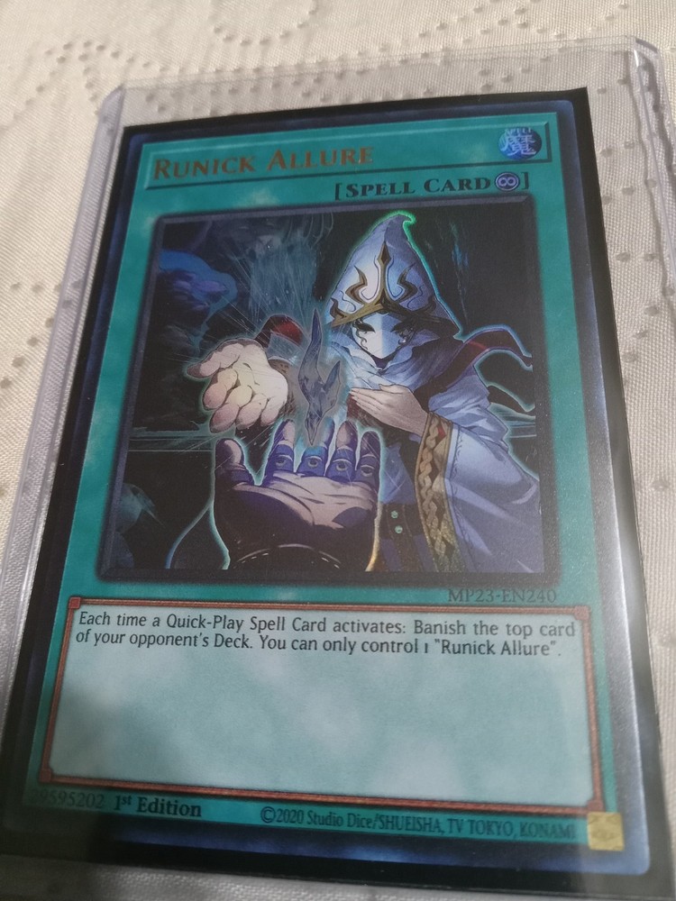 Elevate your Yu-Gi-Oh! TCG strategy with the Runick Allure card from the 25th Anniversary Tin: Dueling Heroes Mega Pack. As a Spell-Continuous card, it offers a unique interaction with Quick-Play Spell Cards, allowing you to banish the top card of your opponent's Deck each time one of your Quick-Play Spell Cards activates. This card, numbered MP23-EN240, is a must-have for any strategic duelist. The Runick Allure comes in Ultra Rare and 1st Edition variants, adding a touch of exclusivity to your collection. Manufactured by Konami and presented in English, it's a standout addition with its distinctive card text that turns the tide of the game in your favor. Control one "Runick Allure" and enjoy the advantage it brings to your battles.