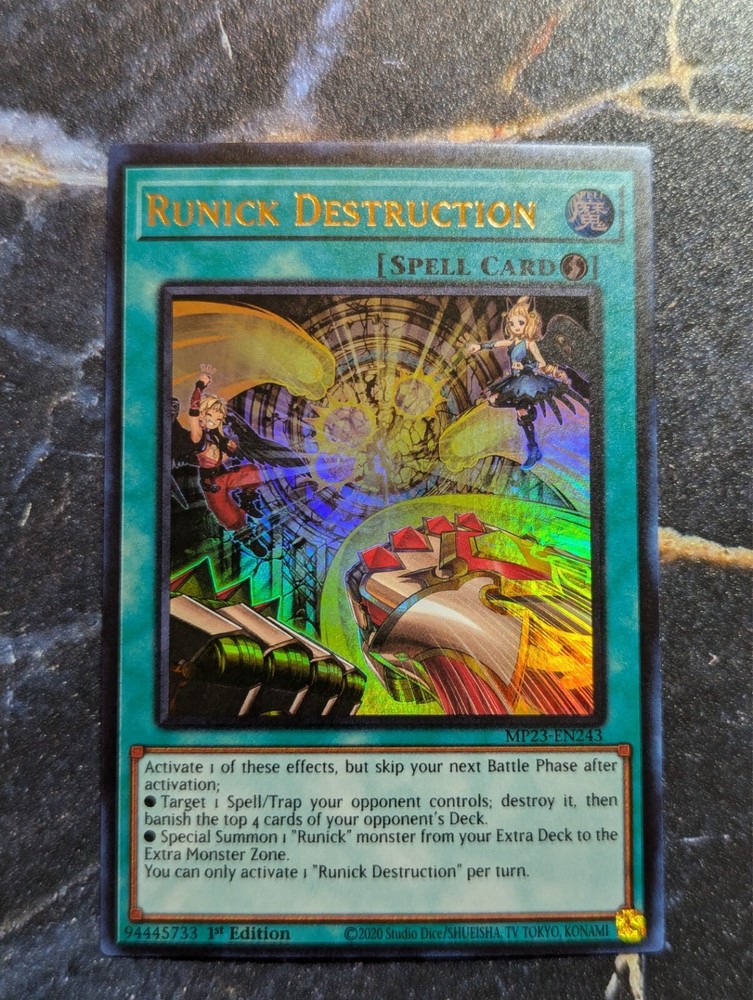 This ultra rare Runick Destruction card is a must-have for any Yu-Gi-Oh! TCG collector. The card features the Spell-Quick Play type and belongs to the 25th Anniversary Tin: Dueling Heroes Mega Pack set. It has the card number MP23-EN243 and is manufactured by Konami. The card is in English language and is a 1st edition. The card's rarity and unique features make it a valuable addition to any collection. It is perfect for players who want to add a powerful card to their deck or collectors who want to complete their set. Don't miss out on the opportunity to own this amazing card.