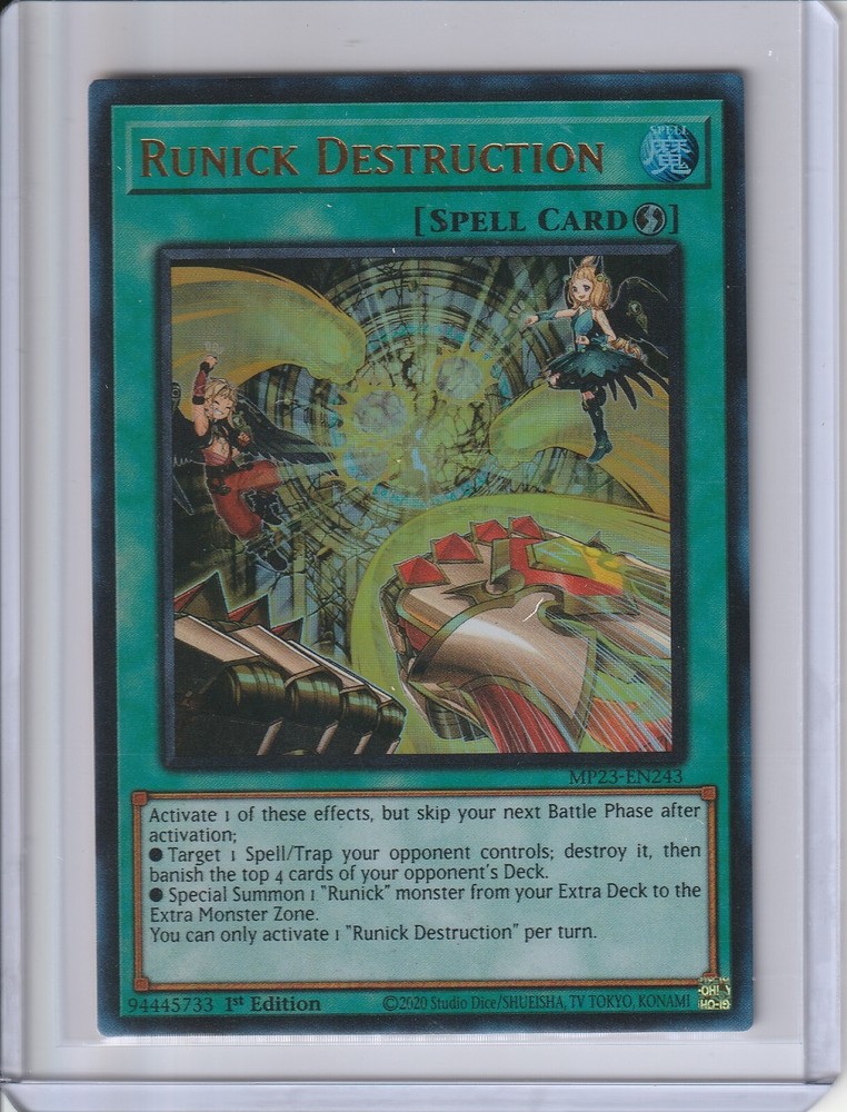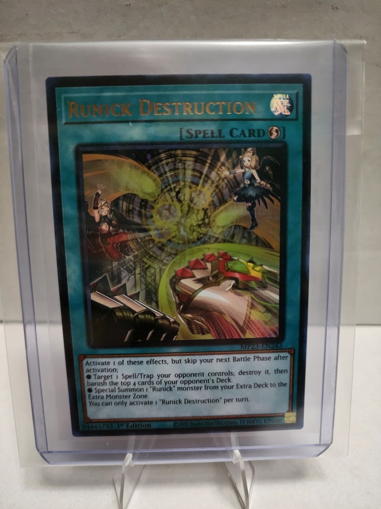 The "Runick Destruction" card is an Ultra Rare 1st Edition Spell-Quick Play card from the Yu-Gi-Oh! TCG 25th Anniversary Tin: Dueling Heroes Mega Pack set. Manufactured by Konami, this English language card has the card number MP23-EN243 and is suitable for players aged 6 and above. With a focus on the Color attribute of Spell, this card offers powerful gameplay options for collectors and players seeking rare and valuable additions to their decks. Personal Collection in Penny Sleeves, along with top loader, any questions, feel free to ask.