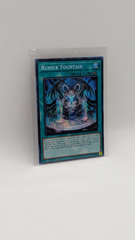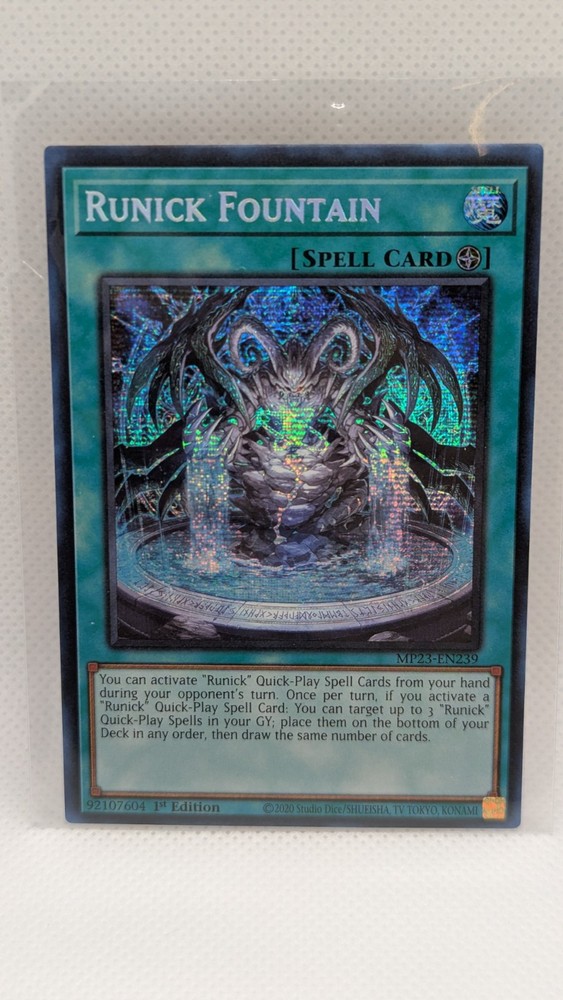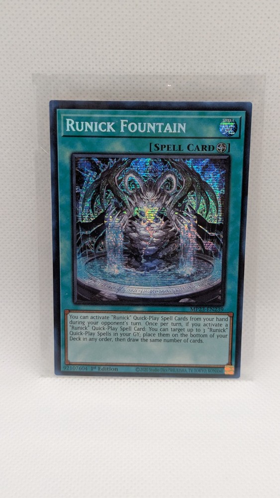Same Day Shipping, Always Pack Fresh, Always Near Mint. The "Runick Fountain" card is a Prismatic Secret Rare Spell-Field card from the 25th Anniversary Tin: Dueling Heroes Mega Pack of the Yu-Gi-Oh! TCG. It allows players to activate "Runick" Quick-Play Spell Cards from their hand during their opponent's turn and has a unique ability to manipulate cards in the Graveyard. The card is in English and is a 1st Edition, manufactured by Konami. It features card number MP23-EN239 and is a valuable addition to any Yu-Gi-Oh! trading card collection.