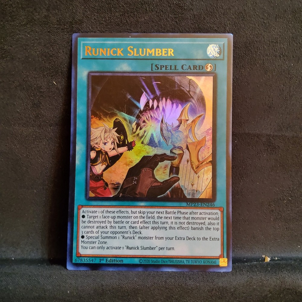 Runick Slumber is an Ultra Rare 1st Edition Spell-Quick Play card from the 25th Anniversary Tin: Dueling Heroes Mega Pack for the Yu-Gi-Oh! TCG. The card features a Hero creature type and is in English language. It is part of the manufacturer Konami's set and has the card number MP23-EN246.