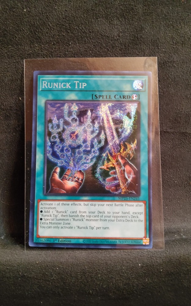 Runick Tip MP23-EN241 is a 1st Edition Prismatic Secret Rare Spell-Quick Play card from the 25th Anniversary Tin: Dueling Heroes Mega Pack set in the Yu-Gi-Oh! TCG. This English card features the Hero monster type and is manufactured by Konami.