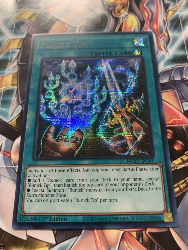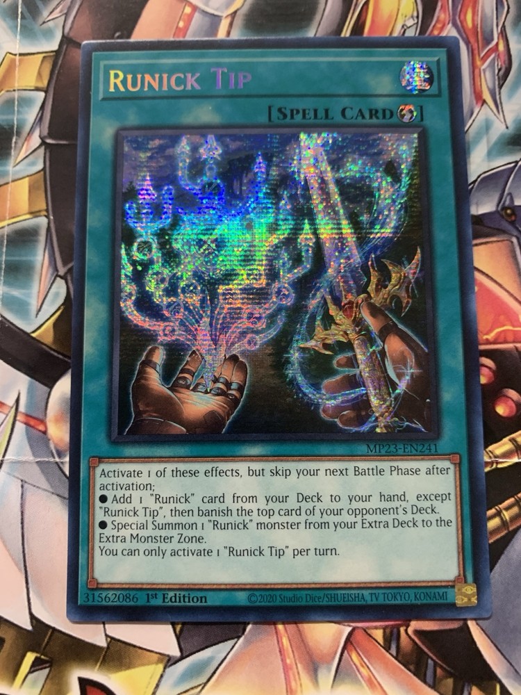 Runick Tip is a 1st Edition Prismatic Secret Rare Spell-Quick Play card from the 25th Anniversary Tin: Dueling Heroes Mega Pack set in the Yu-Gi-Oh! TCG. This English card features the Creature/Monster Type of Hero and is manufactured by Konami. The card number is MP23-EN241. Shipped using eBay Standard Shipping, TRACKING IS NOT ACCURATE. Please message if you have any questions.