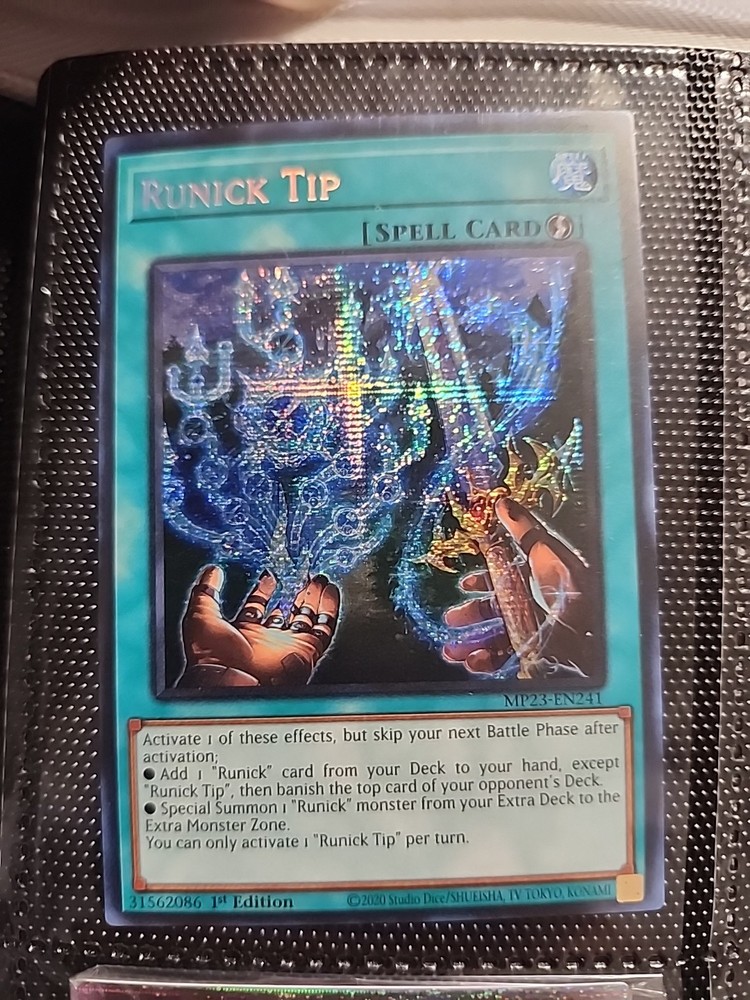 Elevate your Yu-Gi-Oh! TCG strategy with the Runick Tip card, a powerful addition from the Dueling Tin Mega Pack. As a Secret Rare Spell-Normal card, it offers both collectors and competitive players a unique asset to bolster their decks. The card's pristine quality ensures it is a valuable find for those looking to enhance their gameplay or expand their card collection with the sought-after MP23-EN241 variant. Secure this ungraded gem for a touch of exclusivity in your dueling arsenal.
