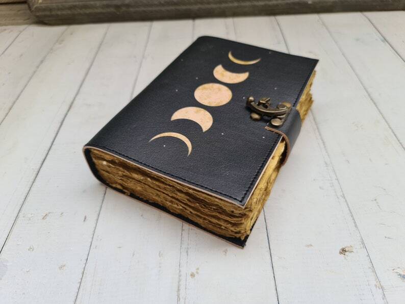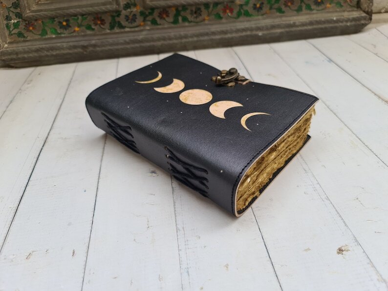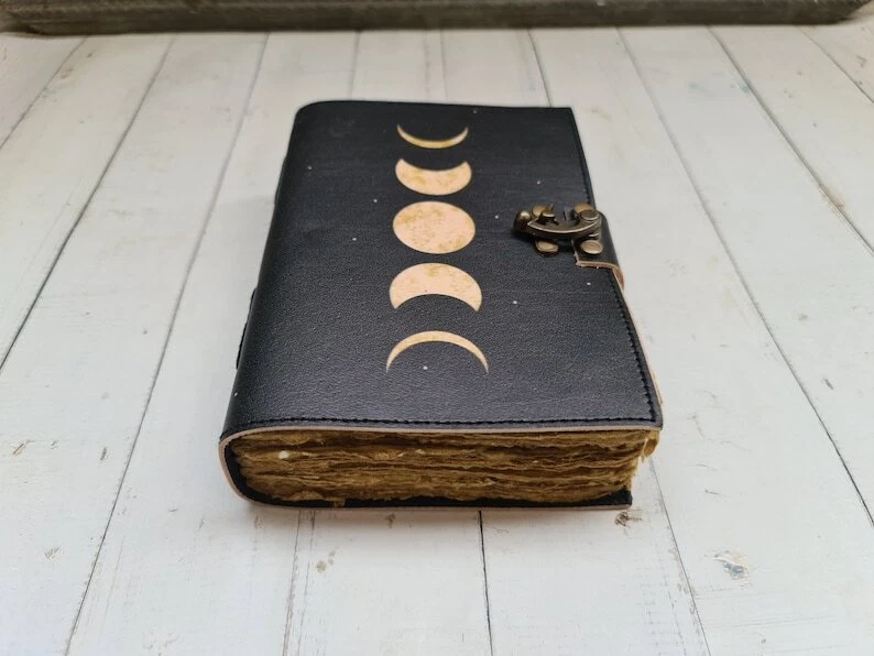 • Triple moon Goddess color printed journal • C-Lock brass • genuine buffalo leather • vintage look deckle edge old paper. Size - 7x5 Inches, 8x6 Inches, 10x7 Inches ● Vintage-style paper with antique, unlined cotton pages that provide a natural texture for an authentic old-world charm. ● Secure vintage-style lock closure to protect personal thoughts, sketches, or spiritual work. ● Eco-friendly and sustainable, made with acid-free, non-bleeding recycled paper that works well with fountain pens, brush pens, and ink. ● A perfect gift for writers, artists, witches, wiccans, and journal lovers who appreciate handcrafted quality.