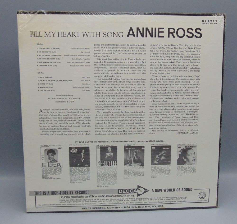 SEALED Annie Ross Fill My Heart With Song LP DL 4922 Decca Records Fill My Heart With Song Annie Ross Decca Records Record Album/Vinyl LP Sealed. Broken Seal in some places, but still closed. Exact copy shown is the album you will receive. We have a 30 Day return policy if you are not satisfied with your purchase. Please do not ask me questions about condition, as I am not knowledgeable about records. Please see photos. Happy Bidding! Shipping Shipping cost: Flat Rate Delivery time: Shipping estimates are not guaranteed and include 2-3 business days handling/processing time. Combined Shipping: For combined shipping, add the items to your shopping cart. Select the option to request a total. I will send a combined shipping invoice within 24 hours. Combined shipping will be calculated by weight or by most economical flat rate option. Payment We accept the following payment methods: Paypal Only Please contact us if you have any questions. Service We are a small woman and veteran, mom and pop operation. We strive to offer the best customer service, including tracking and hassle free returns. Please contact us if there is anything wrong with your order, or for any questions or clarification of our photos or description. Please allow up to 48 hours for a response.