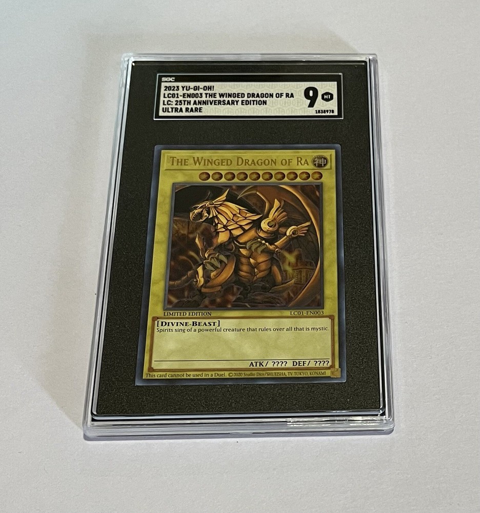 1x 2023 Yu-Gi-Oh! The Winged Dragon Of RA #LC01-EN003 Ultra Rare Limited Edition card. (SGC 9 Mint) This Yu-Gi-Oh! TCG card is a limited edition ultra rare card from the Legendary Collection: 25th Anniversary Edition set. The card features the divine-beast creature type, The Winged Dragon of Ra, with a holographic finish. The card number is LC01-EN003 and it was manufactured by Konami in 2023. It is a perfect addition to any collector's set for the Yu-Gi-Oh! TCG game.