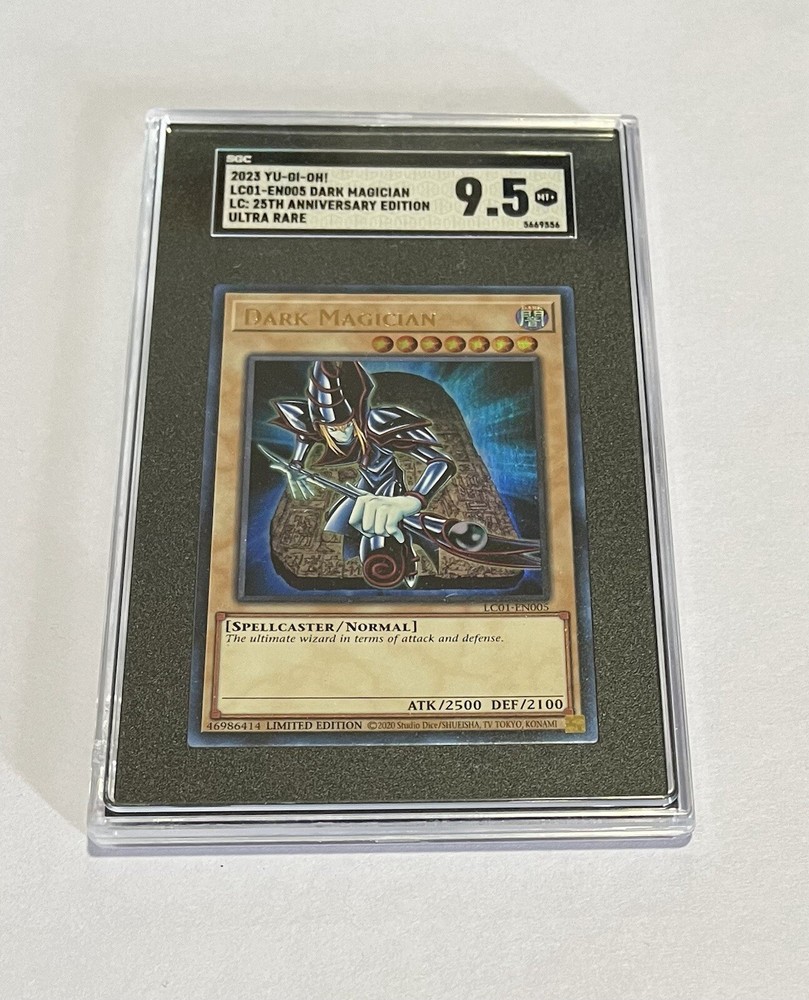1x 2023 Yu-Gi-Oh! Dark Magician #LC01-EN005 Ultra Rare Limited Edition card. (SGC 9.5 Mint Plus) This Yu-Gi-Oh! TCG card is a Limited Edition Ultra Rare Dark Magician from the Legendary Collection: 25th Anniversary Edition set. The card features a holographic finish and has a card number of LC01-EN005. The card is a Normal type and belongs to the Attribute/MTG:Color: Dark category. It is a great addition to any collector's set. Get your hands on this highly sought-after card and add it to your collection today!