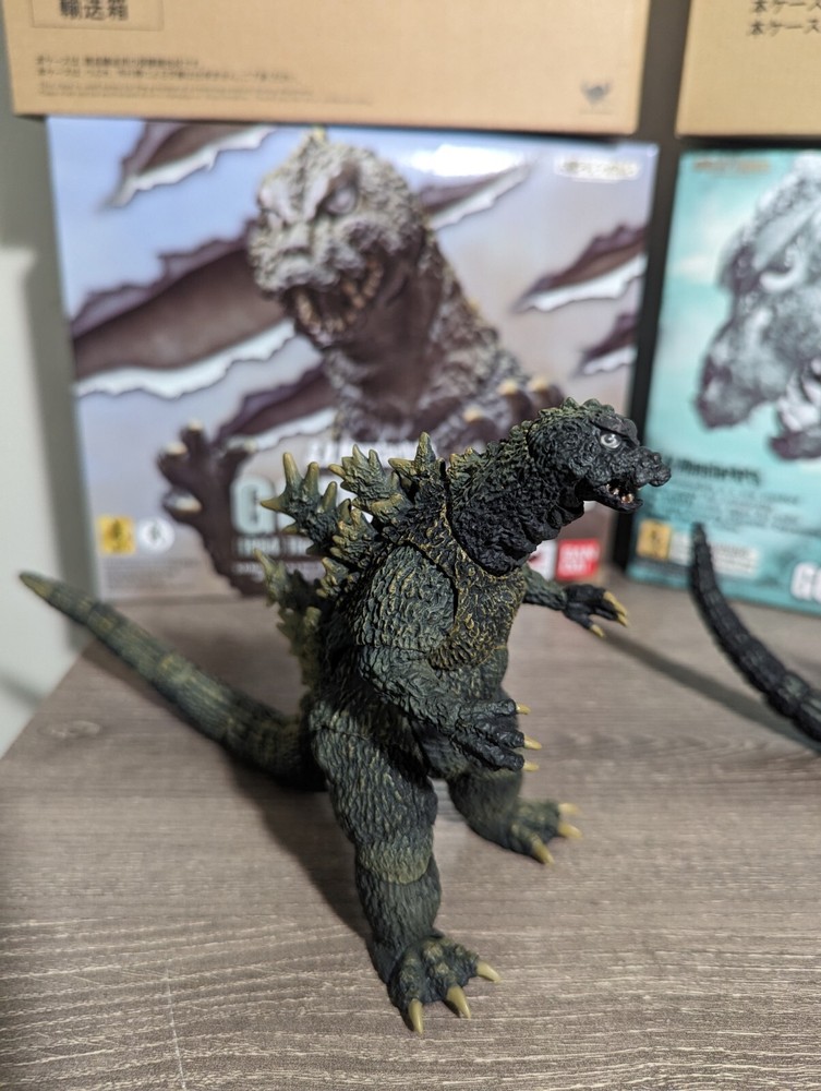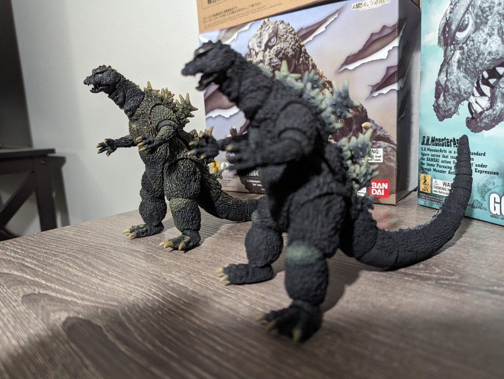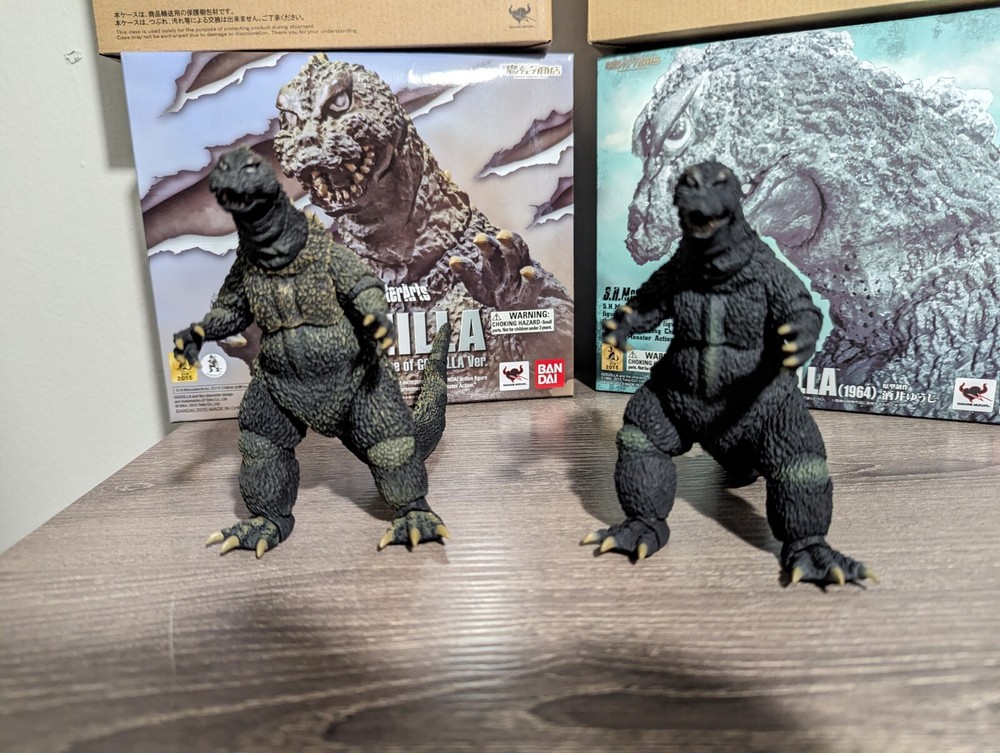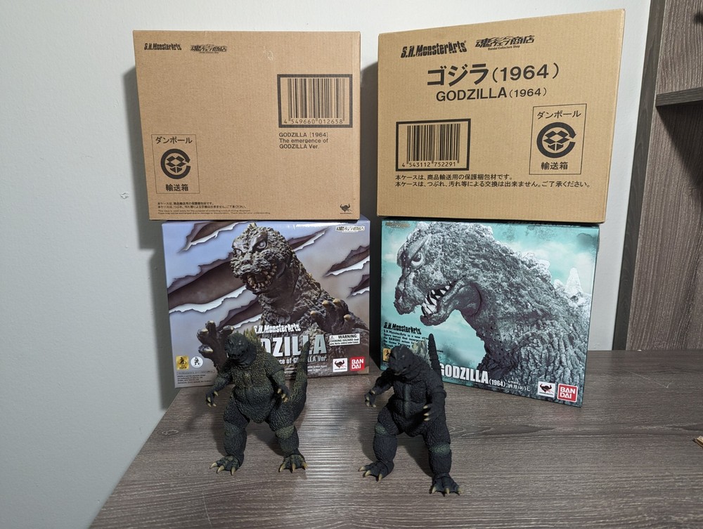 This S.H. MonsterArts Godzilla set is a must-have for collectors! Both figures look amazing, with crisp details and perfect paint. The original version has a slightly loose wrist joint, but it holds poses fine. Barely displayed, so they’re in like-new condition with original boxes. A fantastic addition to any Godzilla collection!