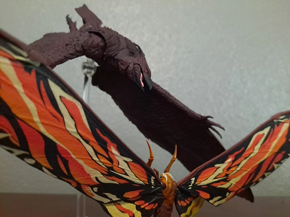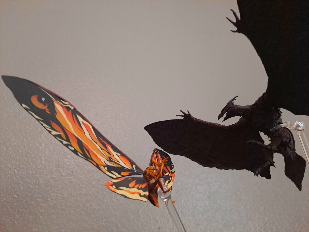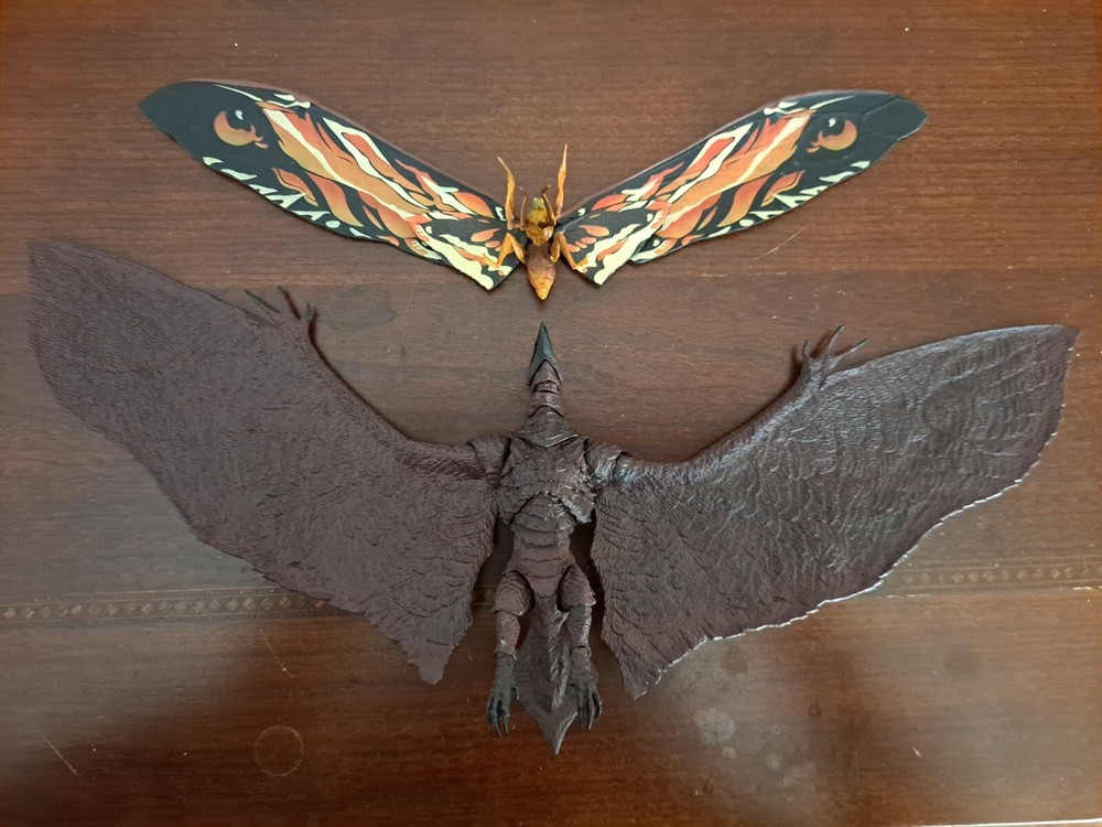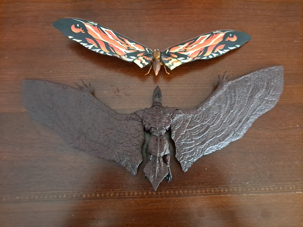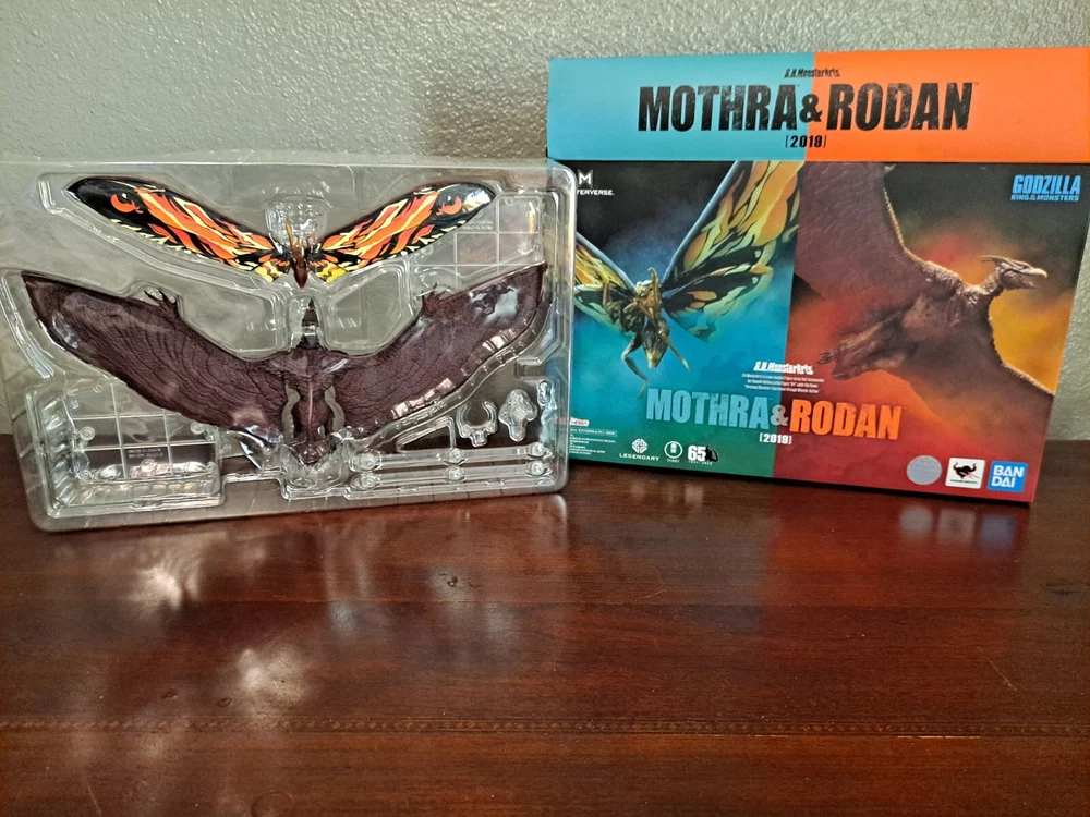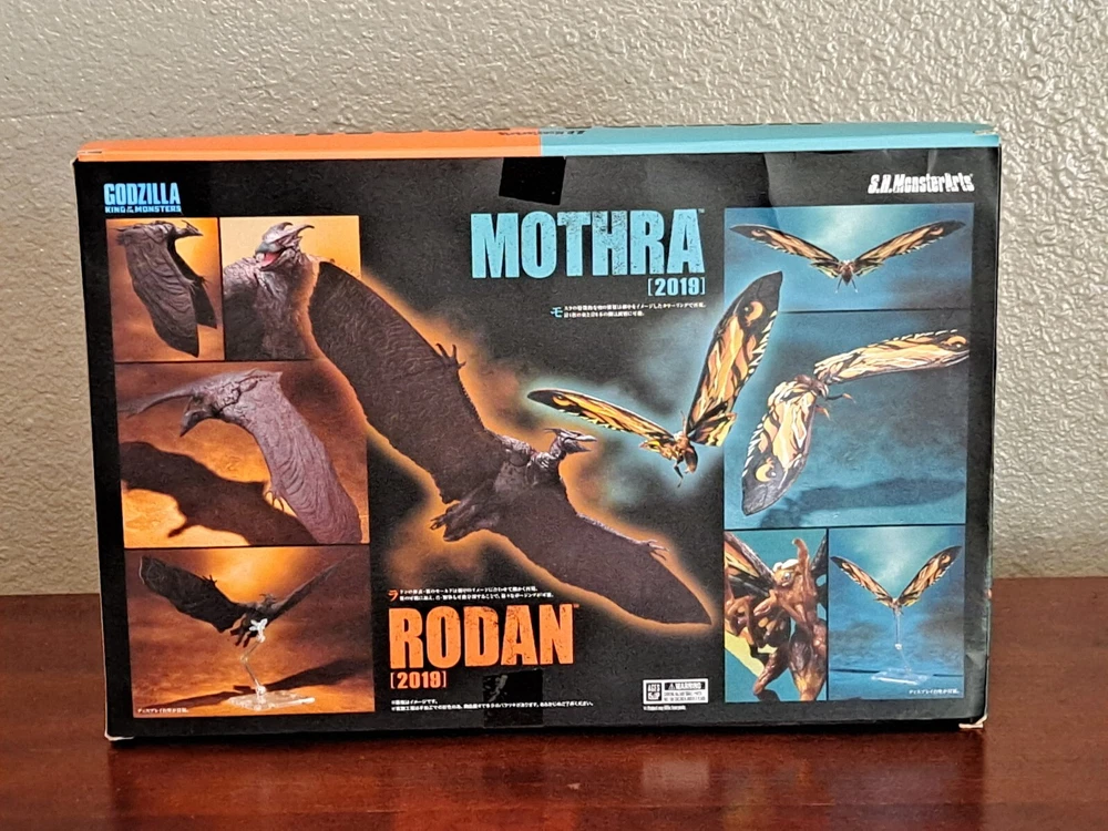 The S.H.MonsterArts Mothra & Rodan 2019 duel set, released November 22nd, 2019, is an unfortunate far cry from the comparatively more posable and dynamic Mothra and Rodan figures of the past. With a lacking range of motion across the board and a complete lack of articulation in either of their wings, these figures may leave most feeling a bit underwhelmed. Be that as it may, though, these two still make for some fantastic display pieces, something that's made especially true when complimented by any of the figure line's other 'Godzilla: King of the Monsters' tie-in releases. Plus, while Mothra here may be a glorified accessory (befitting considering this incarnation's less than tasteful role in the 2019 film), Rodan's figure on the other hand, despite it's stiffness, can still get away with some cool poses so long as you're creative about it. But, I mean, you already know all that, right? Course you do! You're not here 'cause you think these figures are cool themselves, you're here 'cause they make all your actually cool figures look even cooler! Now, now, let's not kid ourselves here. It's alright, I get you. In fact, I'd even say you'd be right for it! I mean, have you seen this gallery? Doesn't it just make that there not included with the set bootleg Godzilla 2019 that you can buy on my store page separately look so much cooler than it already is? Well, Duh! So, what're you waiting for? You go on and you complete that S.H.MonsterArts 'King of the Monsters' set of yours and you do it without coming to regret your purchase in the slightest, and you do it with a smile! BUY MY BIRD AND IT"S MOTH ( 'S.H. MonsterArts Godzilla 2019' sold separately: https://www.ebay.com/itm/126709467828 ) ( Also forgot to mention, but my copy of Rodan has a chipped nail. Pretty common problem for it considering the hard plastic, so do be mindful.)