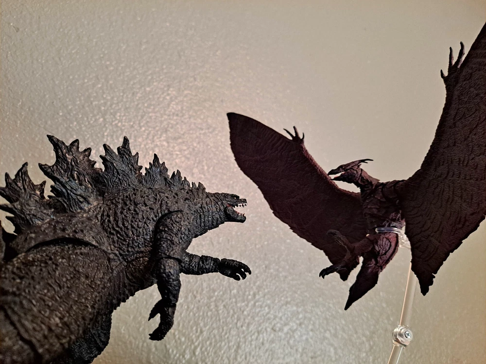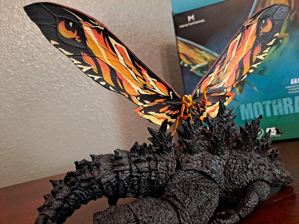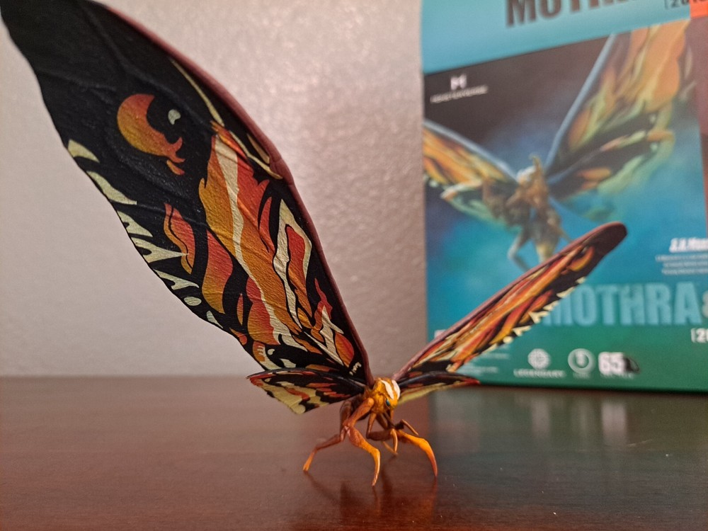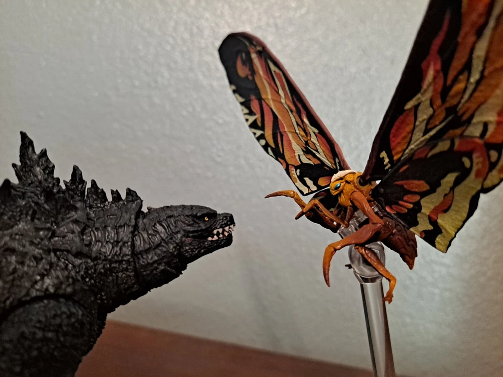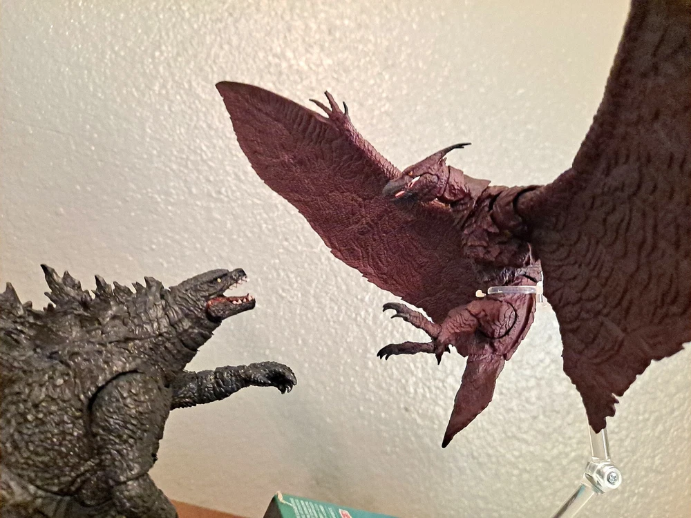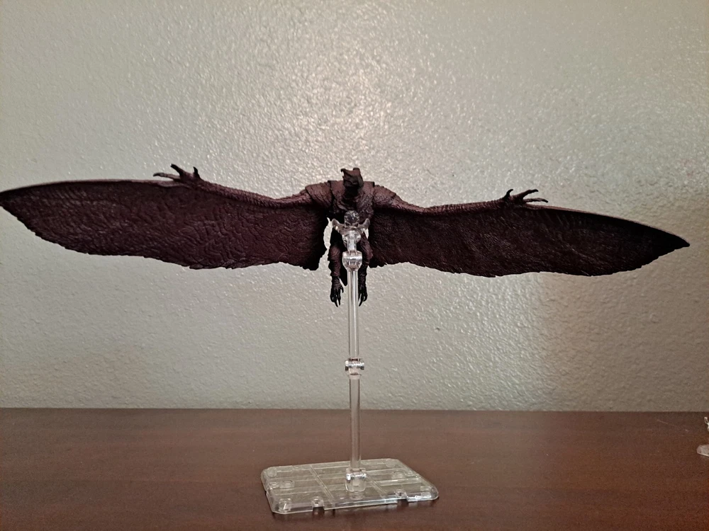 The S.H.MonsterArts Mothra & Rodan 2019 duel set, released November 22nd, 2019, is an unfortunate far cry from the comparatively more posable and dynamic Mothra and Rodan figures of the past. With a lacking range of motion across the board and a complete lack of articulation in either of their wings, these figures may leave most feeling a bit underwhelmed. Be that as it may, though, these two still make for some fantastic display pieces, something that's made especially true when complimented by any of the figure line's other 'Godzilla: King of the Monsters' tie-in releases. Plus, while Mothra here may be a glorified accessory (befitting considering this incarnation's less than tasteful role in the 2019 film), Rodan's figure on the other hand, despite it's stiffness, can still get away with some cool poses so long as you're creative about it. But, I mean, you already know all that, right? Course you do! You're not here 'cause you think these figures are cool themselves, you're here 'cause they make all your actually cool figures look even cooler! Now, now, let's not kid ourselves here. It's alright, I get you. In fact, I'd even say you'd be right for it! I mean, have you seen this gallery? Doesn't it just make that there not included with the set bootleg Godzilla 2019 that you can buy on my store page separately look so much cooler than it already is? Well, Duh! So, what're you waiting for? You go on and you complete that S.H.MonsterArts 'King of the Monsters' set of yours and you do it without coming to regret your purchase in the slightest, and you do it with a smile! BUY MY BIRD AND IT"S MOTH ( 'S.H. MonsterArts Godzilla 2019' sold separately: https://www.ebay.com/itm/126709467828 ) ( Also forgot to mention, but my copy of Rodan has a chipped nail. Pretty common problem for it considering the hard plastic, so do be mindful.)