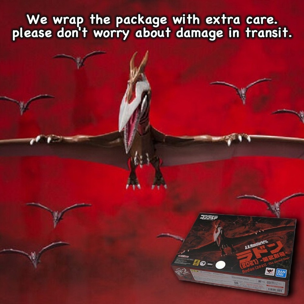 From "Godzilla S.P. " the second form of Rodan (2021) joins S.H.MonsterArts! With sculpting overseen by series kaiju designer Eiji Yamamori , it features accurate details and fine shading to faithfully capture its on-screen appearance. Standing 95mm tall with an impressive 260mm wingspan , articulated wings lets you display Rodan in dynamic flying poses! Eight unpainted mini-figures are also included, with wire supports so you can create "flock" displays. Set includes: Main Body Unpainted Rodan mini-figures (x8) Stand and support set All items are intended for adult collectors and not for children under 13 as there are small sharp items that are choking hazard