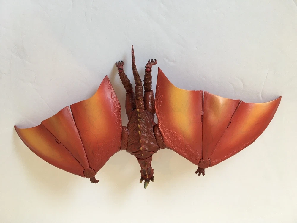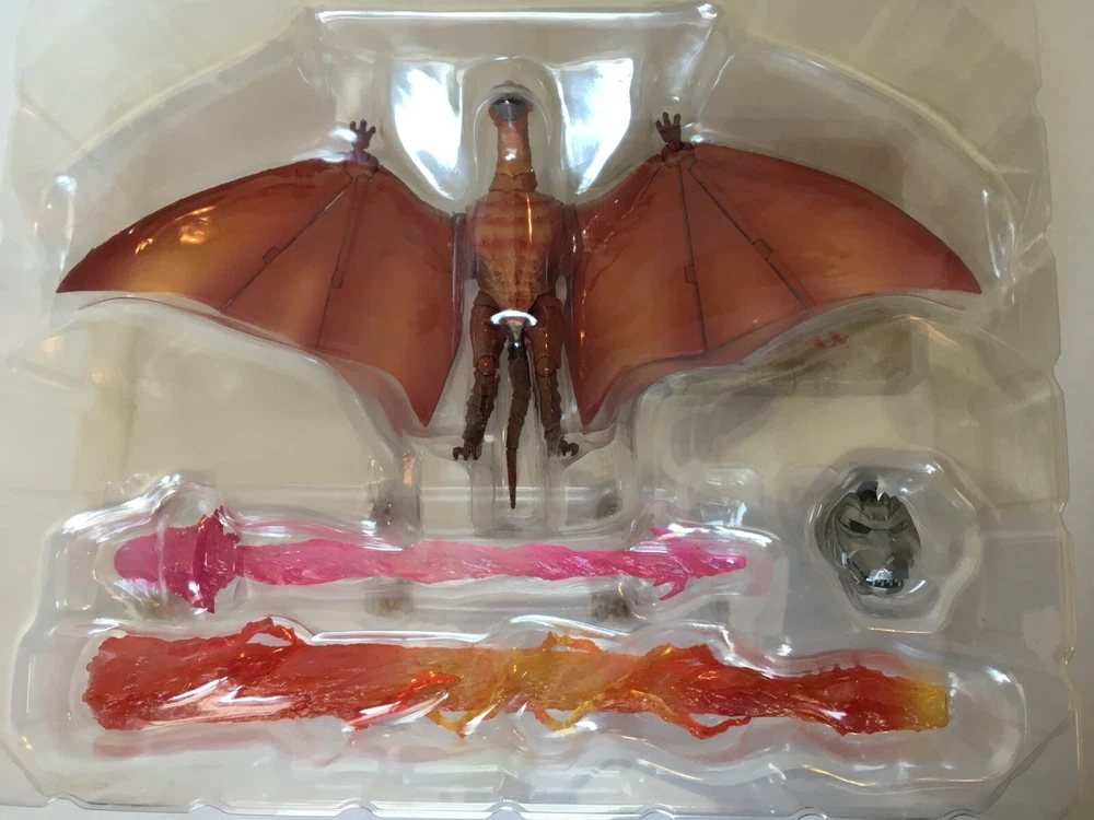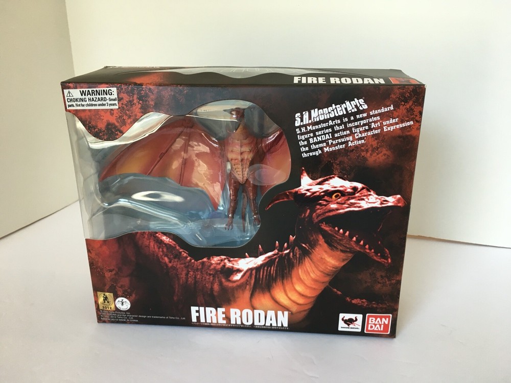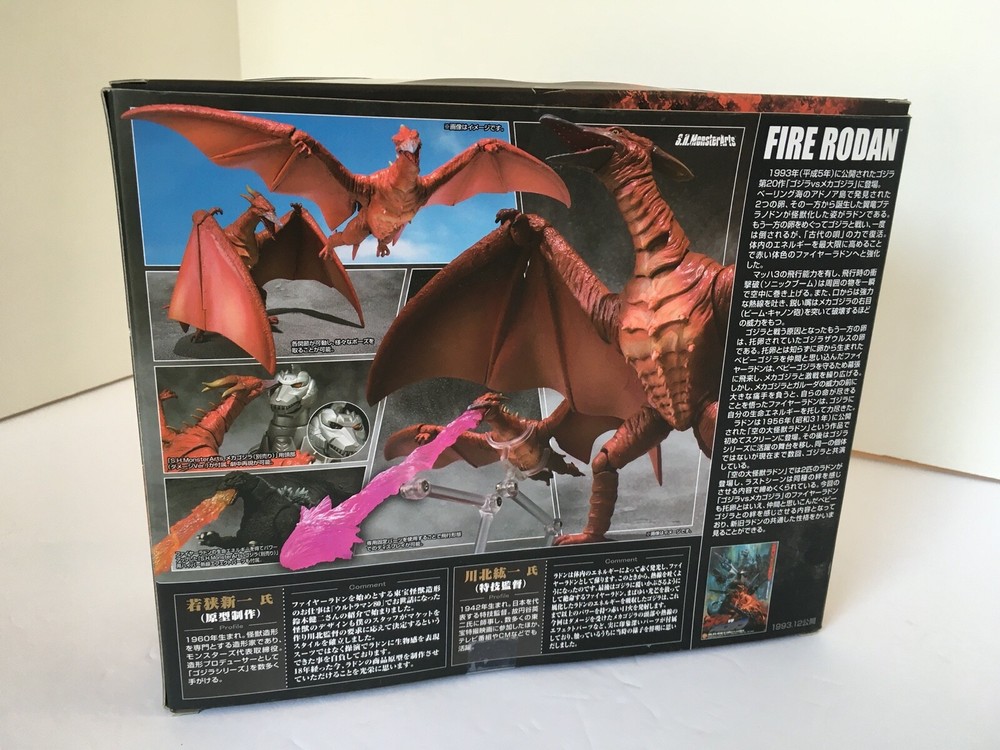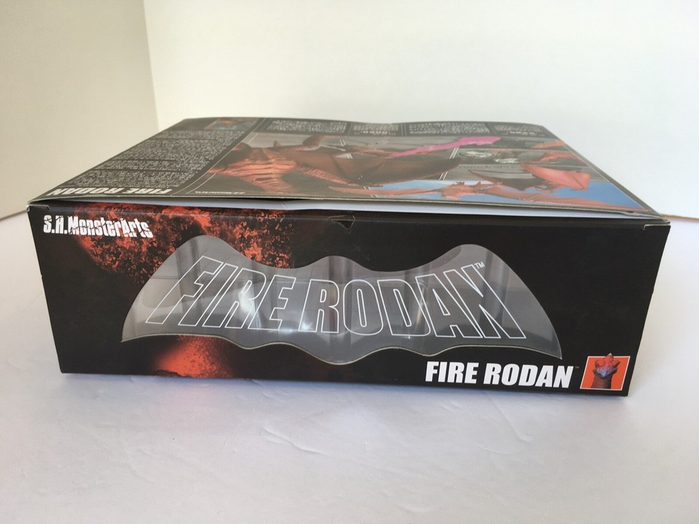 This S.H. monster arts rodan is in great condition. The only problem that I see with it is that the piece that holds the figure on the stand for flight mode is cracked where the piece meets the stand. It is still functional, though. Some wear on the box and the corners, and light scratches on the box, see pictures. Comes with extra base and stand. No international shipping including Alaska and Hawaii.