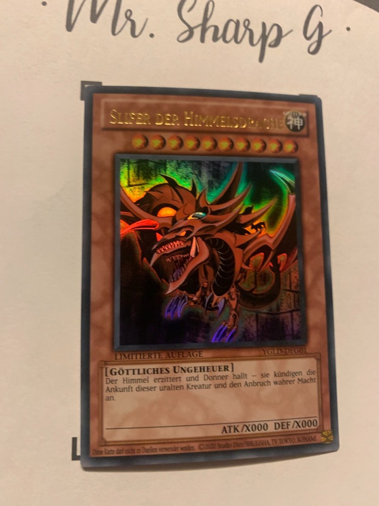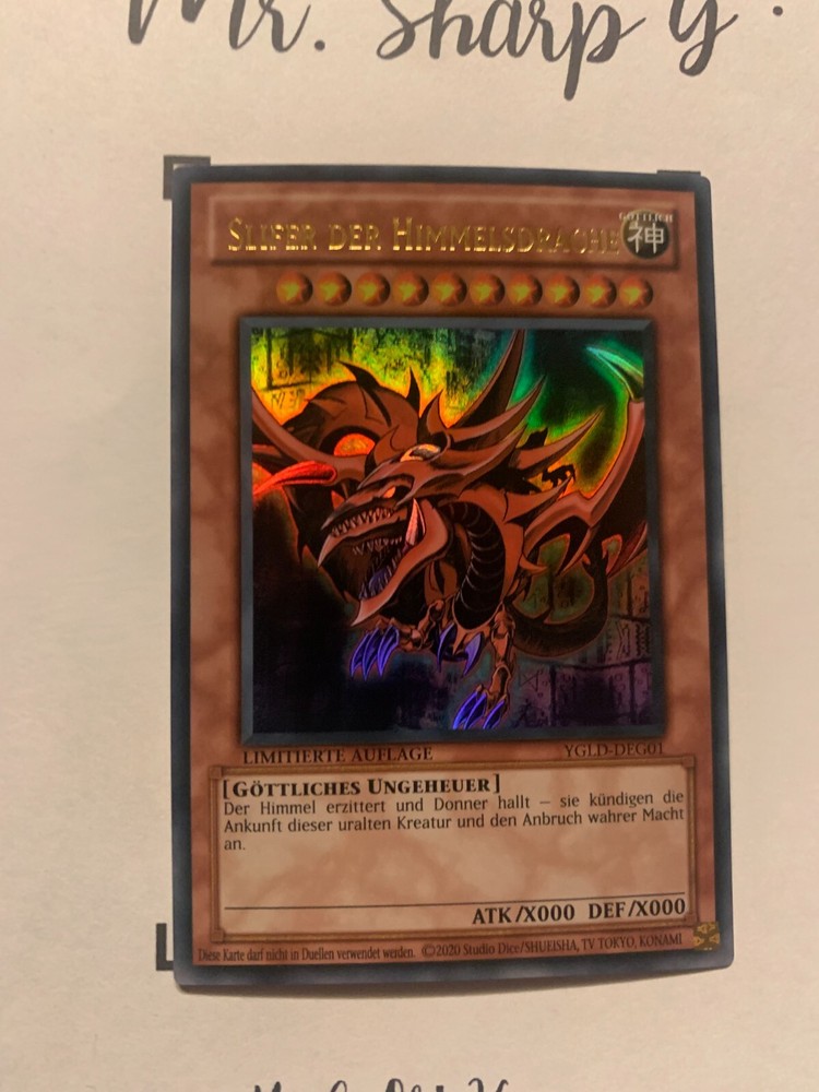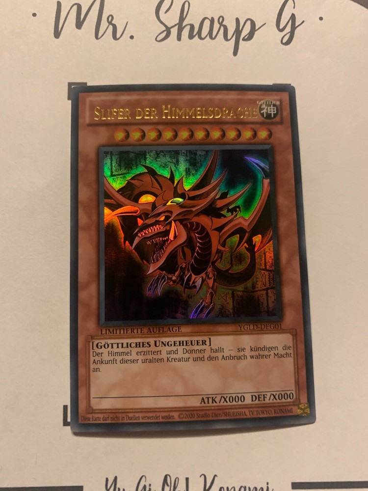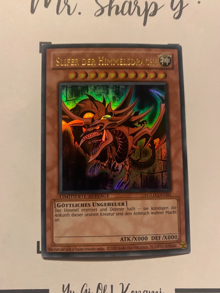 - Mr. Sharp G - - Online Store - TRADING CARDS-TCG-COLLECTION-SETS-TOURNAMENT-Yu Gi Oh! Konami * * * SLIFER DER HIMMELSDRACHE - LIMITIERTE AUFLAGE YGLD-DEG01 - Bitte schauen Sie sich die beigefügten Bilder an, um einen vollständigen Überblick über den Zustand jedes Artikels zu erhalten. - Zustand des Artikels: Neu* - in einem neuwertigem Zustand. (* Neuer Zustand - kann aber leichte Mängel wie 'whitening', leichte Eindrücke, Dellen u.a. haben - die von der Herstellung der Karte aus Produktion stammen, bitte den Bildern und in der Beschreibung den Zustand entgegennehmen) - Typ/ Serie: GÖTTLICHES UNGEHEUER / LIMITIERTE AUFLAGE YGLD-DEG01 - Seltenheitsstufe/ Rarity: ULTRA RARE - Edition : YUGI'S LEGENDARY DECKS / 2015 / DEUTSCH * * * + Kartenschutzhülle & Toploader inklusiver im Preis + mehrfache Bestellung = einmalige Versandkosten + versicherter Versand Bestellung in Höhe - v. 8,50EUR in Deutschland/ Inland - v. 12,50EUR im Ausland/ International + Großbestellungen kostenloser Versand Inland und International - Bei Fragen, Details, nicht im Bestand gewünschte Karten/ Artikel oder Versandgutschriften schreiben Sie uns! Wir freuen uns auf Ihre Nachricht! - Vielen Dank für Ihr Vertrauen, Unterstützung und Besuch in unserem Store ! - Ihr Mr. Sharp G Team