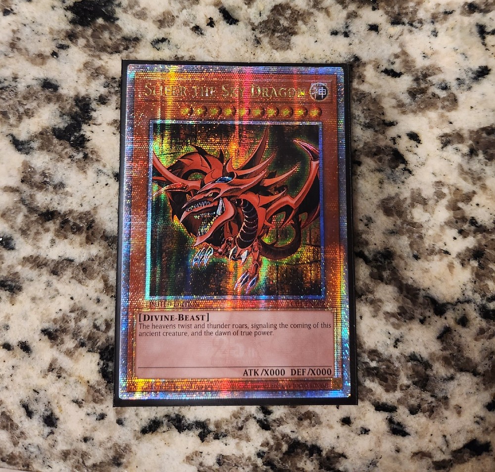 This Secret Rare Slifer the Sky Dragon is absolutely stunning! Pulled fresh from the pack and instantly sleeved, it's in flawless near-mint condition—perfect for collectors or players looking to add a powerful, high-value card to their deck. The artwork pops with vibrant colors, and the holographic foil makes it a true standout. Whether you're aiming to grade it or play it, this card delivers. A must-have for any Yu-Gi-Oh! enthusiast!