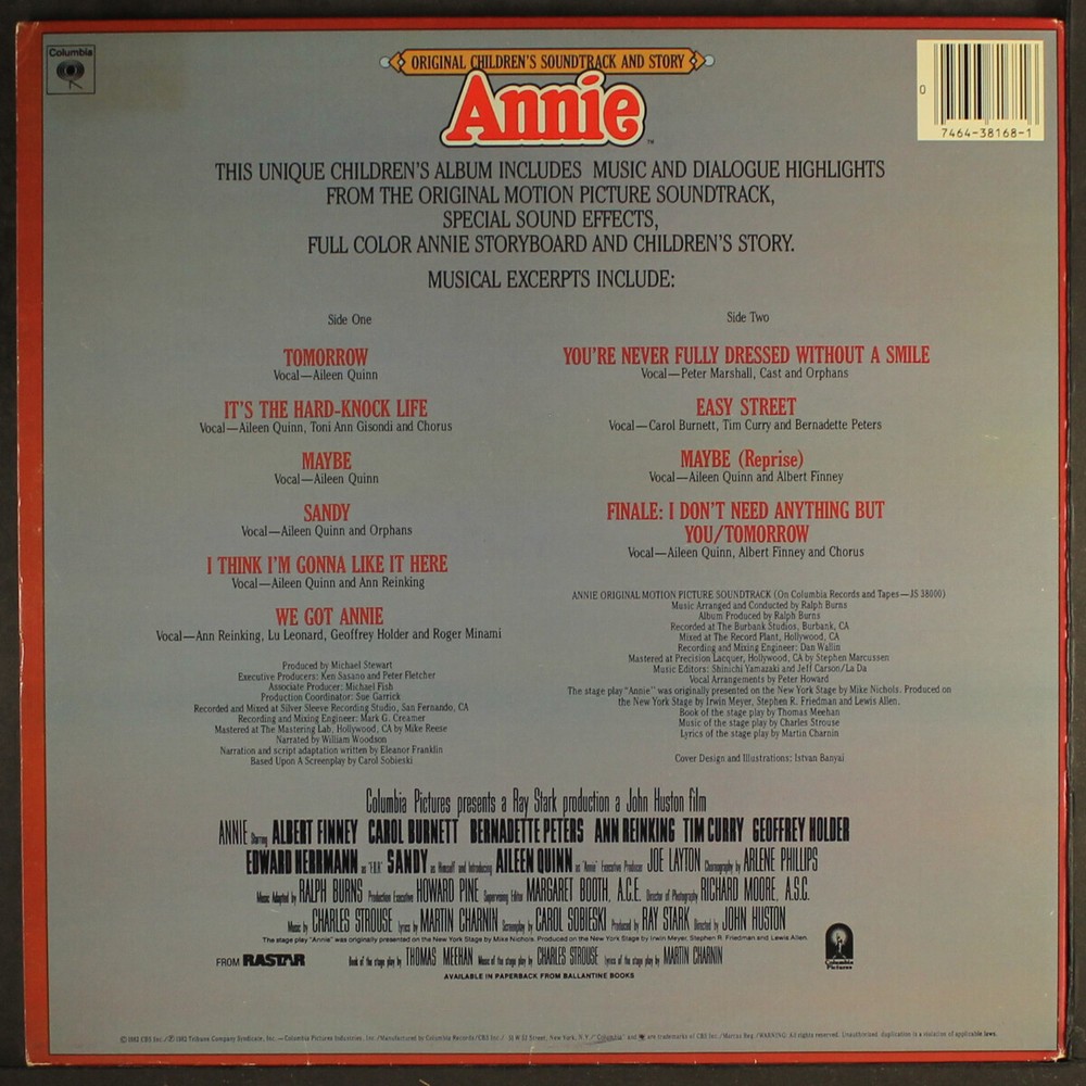 Item Details SOUNDTRACK annie Label: COLUMBIA 38168 Format: 12" LP (33 RPM), gatefold Disc Condition: VG- Cover Condition: VG+ , crayon coloring inside gatefold, tiny corner dings, a couple small stains on front/back Genre: Soundtrack & Cast Price: $8 Shipping Info All orders are processed and shipped within 2 business days of receipt. We package and ship our vinyl records with the greatest care, using extra-thick packaging to ensure that your rare and collectible vinyl records arrive in pristine condition. Domestic Shipments USPS Priority Mail LP Only Shipments $15 for 1st LP + $2 each additional LP 45s, CDs and Cassettes $10.00 for 1st + $1 each additional Mixed Shipments $15 for 1st LP + $2 each additional LP / $1 each additional 45/CD/Cassette Oversized CDs, Cassettes, & 45s $14 base rate for 1st / $1 base rate each additional oversized + $1 each 45/CD/Cassette USPS Media Mail LP Only Shipments $7 for 1st LP + $1 each additional LP Mixed Shipments $7 for 1st LP + $1 each additional Oversized CDs, Cassettes, & 45s $6 base rate for 1st + $1 each 45/CD/Cassette Note: All domestic shipments are insured. International Shipments Air Mail LP Only Shipments $20 for 1st LP + $5 each additional LP 45 Only Shipments $18 for 1st 45 + $1 each additional 45 Mixed Shipments $20 for 1st LP + $5 each additional LP / $1 each additional Oversized CDs, Cassettes, & 45s $19 base rate for 1st / $1 each additional oversized + $1 each 45/CD/Cassette Note: Double LPs, box sets, etc. will incur additional shipping costs as indicated above. Record Grading Grade Explanation SS Still Sealed In factory-fresh condition. M Mint We don't use this grade. M- Mint Minus A near perfect, probably unplayed record. VG+ Very Good Plus Close to like new with only superficial signs of use that don't affect play. Only well cared for records will grade out to VG+. Will satisfy all but the most demanding collector. VG Very Good A used, reasonable copy. There will be obvious signs of wear and the possibility of light surface noise between tracks or during quiet passages, but still quite nice. VG- Very Good Minus Significant wear and marks and usually quite noticeable surface noise. G+ Good Plus In the record world, 'Good' is not good! From here on down (Fair, Poor), we're talking about beat-up records. * Unless noted, every record is an original issue for the label and catalog number. About Us Records By Mail offers one of the most comprehensive selections of vinyl LPs and 45s available anywhere. Housed in an 8,000 square foot warehouse that currently holds over 2 million records, Craig and his talented, dedicated staff serve music lovers in more than 60 countries. Records by Mail prides itself on maintaining one of the largest selections of rare vinyl records available anywhere—online or off. We are always looking to improve the quality of our service, and we update our database every day, so expect new titles and improvements with alarming frequency. Browse Categories Rock & Pop Soul Blues & R&B Oldies Jazz Funk Vocal Groups Rockabilly Country Vocalists Brazilian Punk/New Wave Easy Listening Soundtracks Reggae Black Gospel Rap/Hip-Hop Latin Our Guarantee We guarantee every item we sell to be as listed. We endeavor to provide superior service, but if we make an error, we'll make every effort to make it right either by refunding all costs involved, or adjusting the selling price to everyone's satisfaction.