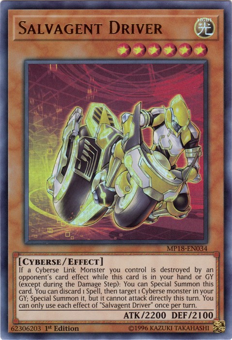 Salvagent Driver - MP18-EN034 - Ultra Rare - 1st Edition Image is a stock photo of the card. You will receive the card in Moderately Played condition Condition: Moderately Played ATK/DEF : 2200/2100 Attribute : Light Card Number : MP18-EN034 Card Rules : Card Text : If a Cyberse Link Monster you control is destroyed by an opponent's card effect while this card is in your hand or GY (except during the Damage Step): You can Special Summon this card. You can discard 1 Spell, then target 1 Cyberse monster in your GY; Special Summon it, but it cannot attack directly this turn. You can only use each effect of "Salvagent Driver" once per turn. Card Type : Effect Monster Edition : 1st Level : 6 Monster Type : Cyberse Name : Salvagent Driver Passcode : 62306203 Pendulum Scale : Rarity : Ultra Rare Set : 2018 Mega-Tin Mega Pack Be sure to visit our store for a wide selection of your favorite cards! We are running specials RIGHT NOW!! Shipping Options: ~Ships in a regular white envelope with a stamp for FREE! (THERE IS NO TRACKING INFORMATION AVAILABLE FOR THE ABOVE METHOD. SHIPPING TIME IS 4-10 BUSINESS DAYS) ~Ships in a TRACKEDbubble mailer for $5.99! ~Shipments are handled same or next business day. ~FREE SHIPPING for each additional card, so shop around our store!