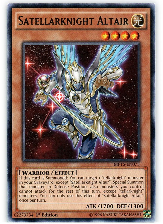 Satellarknight Altair - MP15-EN075 - Rare - 1st Edition Image is a stock photo of the card. You will receive the card in Heavily Played condition Condition: Heavily Played ATK/DEF : 1700/1300 Ability : Attack #1 : Attack #2 : Attack #3 : Attribute : Light Card Number : MP15-EN075 Card Rules : Card Text : If this card is Summoned: You can target 1 "tellarknight" monster in your Graveyard, except "Satellarknight Altair"; Special Summon that monster in Defense Position, also monsters you control cannot attack for the rest of this turn, except "tellarknight" monsters. You can only use this effect of "Satellarknight Altair" once per turn. Card Type : Effect Monster Edition : 1st Finish : HP : Illustrator : Level : 4 Manufacturer : Monster Type : Warrior Name : Satellarknight Altair Passcode : 02273734 Pendulum Scale : Rarity : Rare Resistance : Retreat Cost : Set : 2018 Mega Tin Pack Stage : Weakness : Be sure to visit our store for a wide selection of your favorite cards! We are running specials RIGHT NOW!! Shipping Options: ~Ships in a regular white envelope with a stamp for FREE! (THERE IS NO TRACKING INFORMATION AVAILABLE FOR THE ABOVE METHOD. SHIPPING TIME IS 4-10 BUSINESS DAYS) ~Ships in a TRACKEDbubble mailer for $5.99! ~Shipments are handled same or next business day. ~FREE SHIPPING for each additional card, so shop around our store!