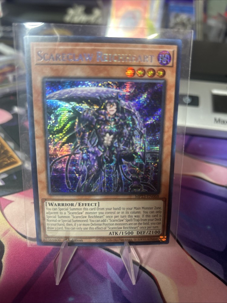 The "Scareclaw Reichheart" card is a Dark Warrior monster with 1500 Attack and 2100 Defense points. It is a Prismatic Secret Rare card from the 25th Anniversary Tin: Dueling Heroes Mega Pack in the Yu-Gi-Oh! TCG. This 1st Edition English card (Card Number: MP23-EN068) features an Effect ability and is manufactured by Konami.