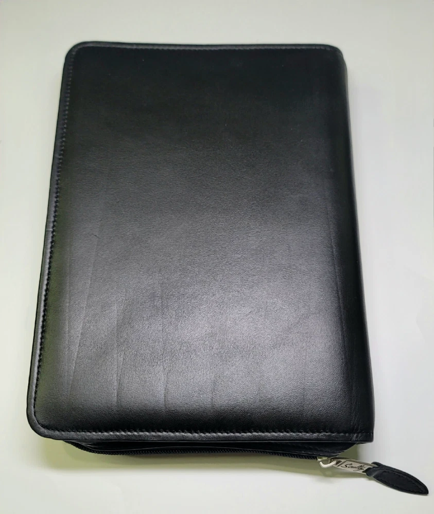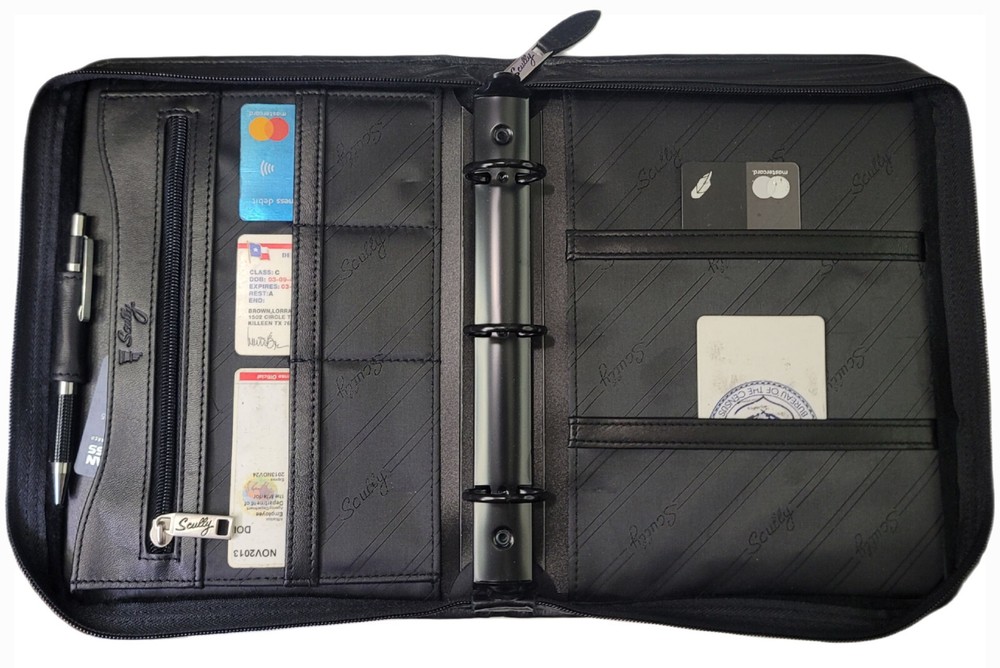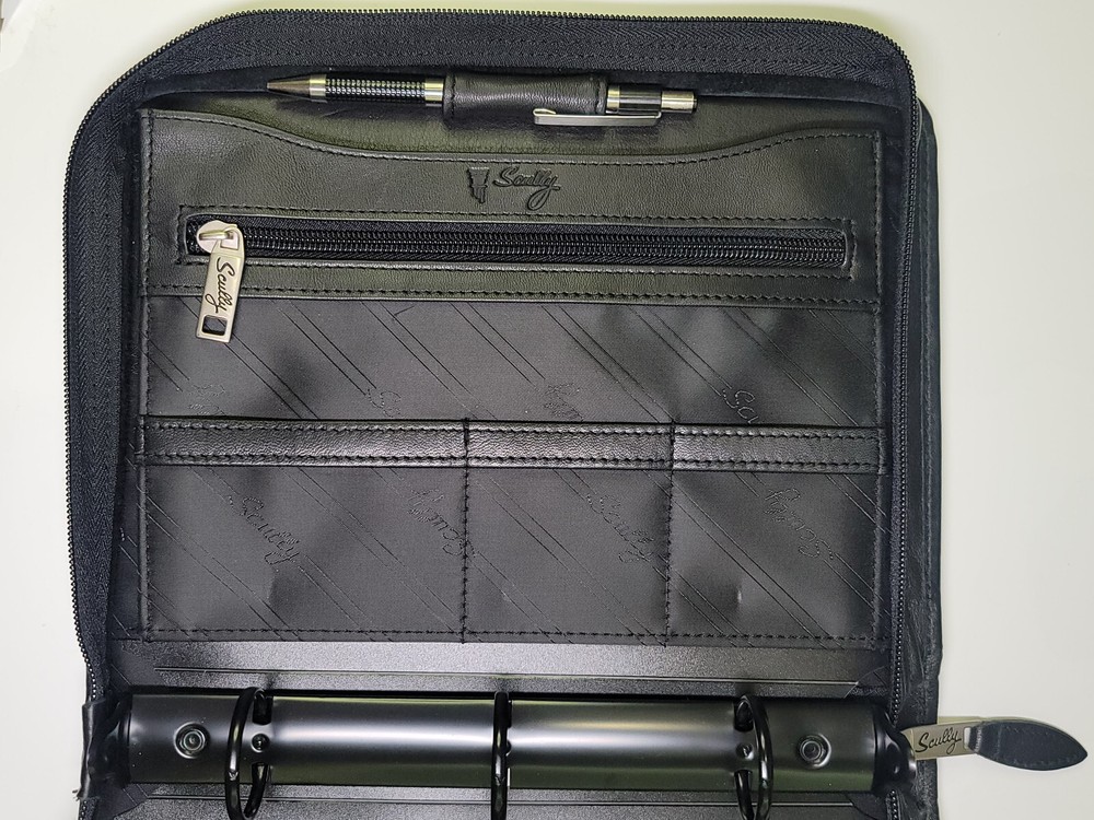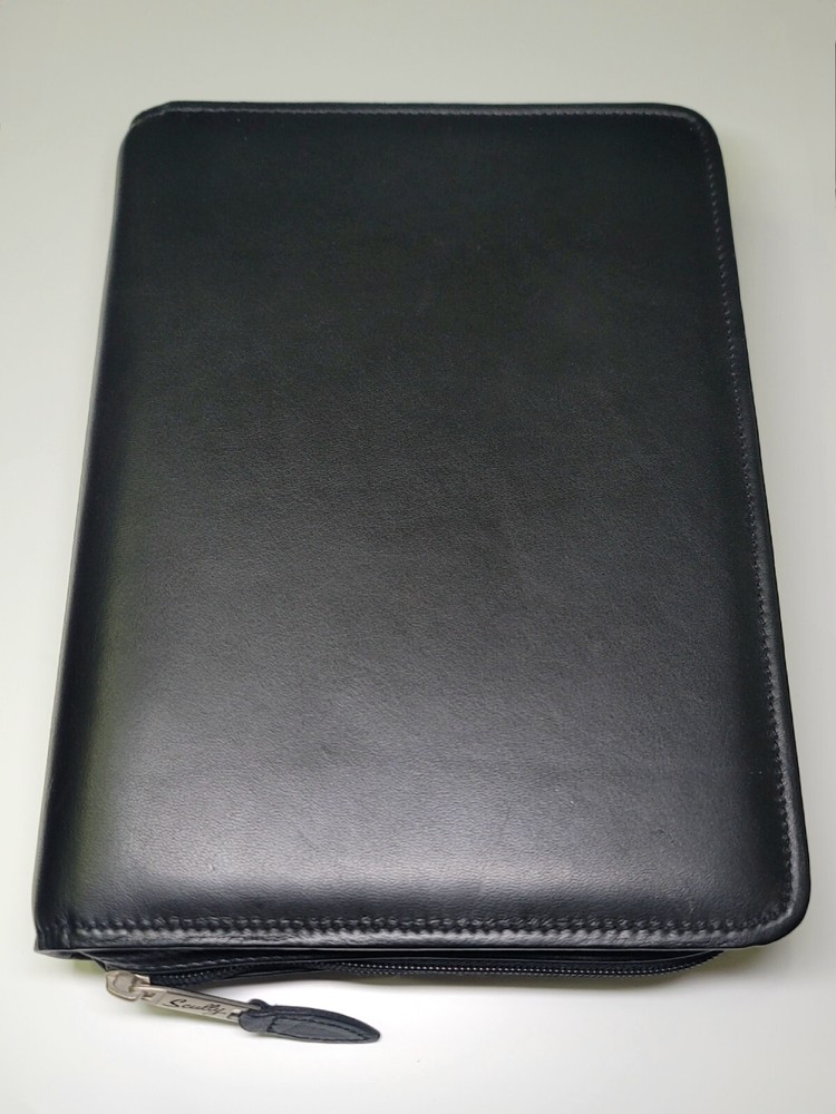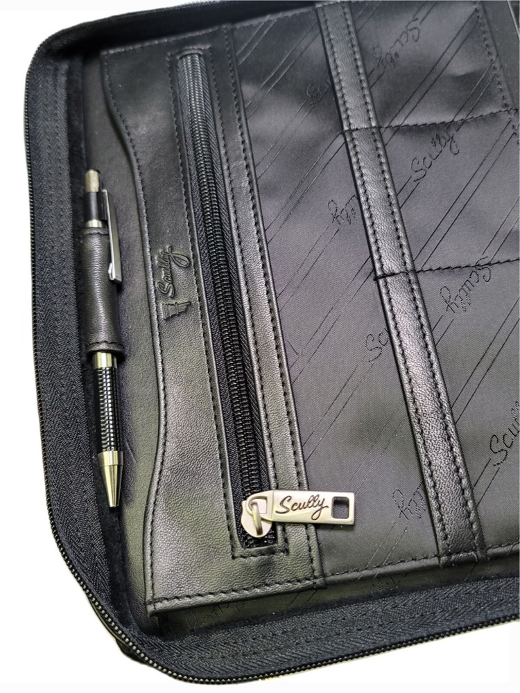 Scully 2110z Leather Zip 3-Ring Organizer Planner The original 3 RING ZIP WEEKLY. Similar to Model 8053Z, but with 2 extra pockets MSRP: $220 Recently conditioned Excellent overall condition. Rings & zippers work perfectly. Like-new interior. Excellent condition outer - front looks great, rear has some light shelf marks from long term storage (see last pic). Not sure if they will slowly dissipate Made with buttery calf-skin leather. Features 1 open inner pocket, 1 inner zip pocket, pen holder, pen, 3 small card pockets, 2 medium document pockets Dimensions: 7.5" x 10" x 2" Supports 5.5" x 8.5" (3 Ring 5 x 8) paper system Refills found here: https://www.scullyplanner.com/index.php/refills/paper-default-loose-leaf/3-ring-5-x-8.html?product_list_limit=24