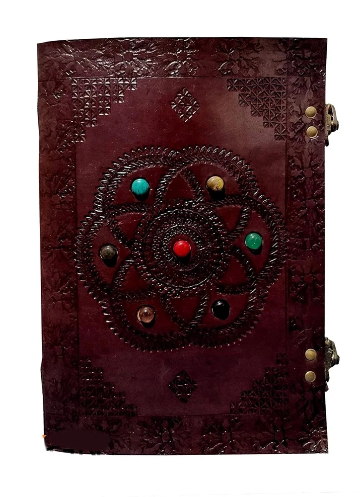 PERFECT BEAUTIFULLY EMBELLISHED ANTIQUE STYLE NOTEBOOK - CHAKRA STONE Vintage, antique appearance of our handmade notebooks will make you feel like travelling in time and look intriguing to others. Ideal for Artists, Writers, Travelling, Business, Poetry, Journalists, Food Planner, Scrapbook etc. Its Soft & Supple Dark Brown Genuine Leather keeps the real leather scent and it's naturally tanned with special oil, to keep safely and beautifully your thoughts, plans & ideas. Our paper is produced using Cotton Bio-Mass and is also acid free. Our notebooks are big enough to keep you inspired, but compact enough for carrying in your bag. 200 nicely thick pages with embossed designs on both front and back covers and stylish lock (depends on the model). We are very proud to bring more than 100 years' experience of traditional Indian craftsmanship.