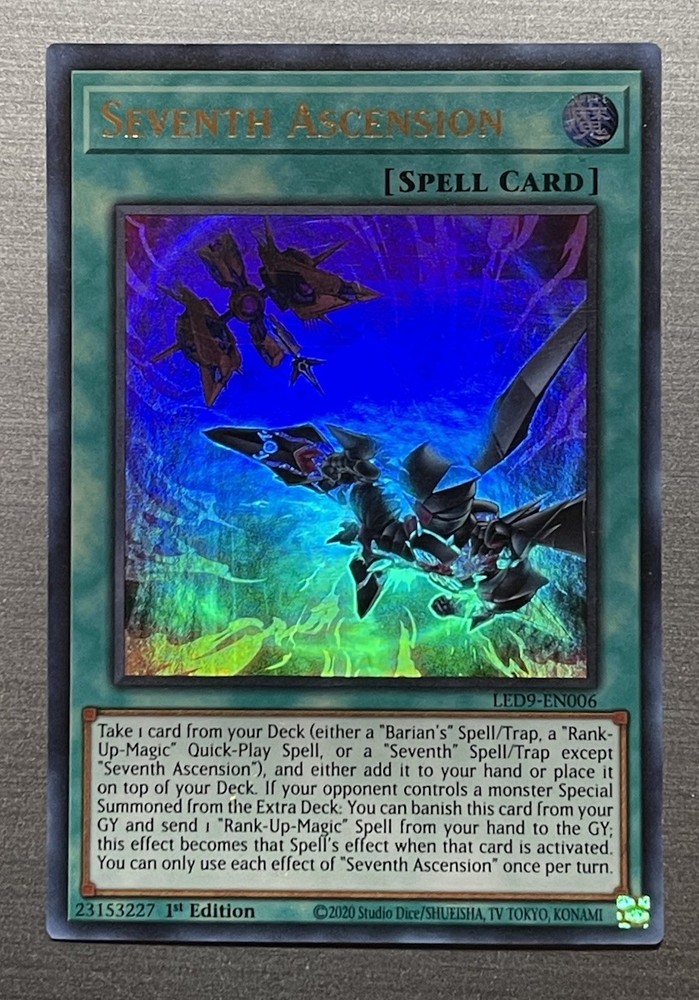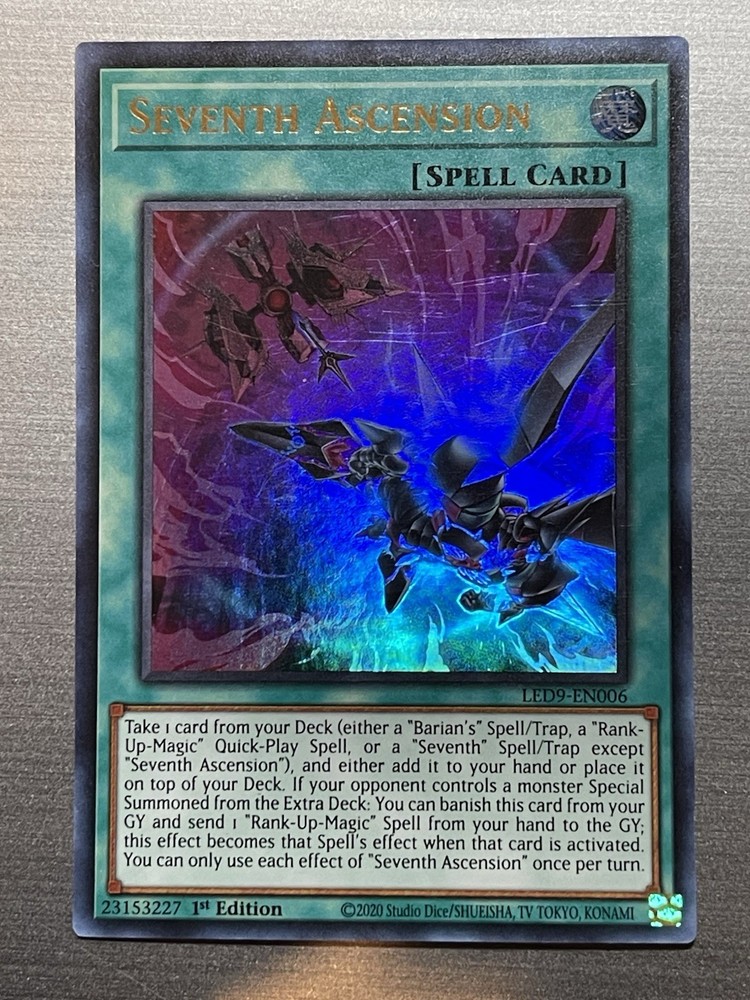 The Seventh Ascension LED9-EN006 1st Edition card is an ultra rare collectible card game item from the Yu-Gi-Oh! TCG series. Manufactured by Konami, this English-language card belongs to the Legendary Duelists set and features a holo finish. As a spell card designed for strategic gameplay, it holds value for collectors and players looking to enhance their deck with unique and powerful cards from the Yu-Gi-Oh! universe. Card is enclosed in a secure hard plastic sleeve for safe handling and shipping, including a free USPS tracking number!