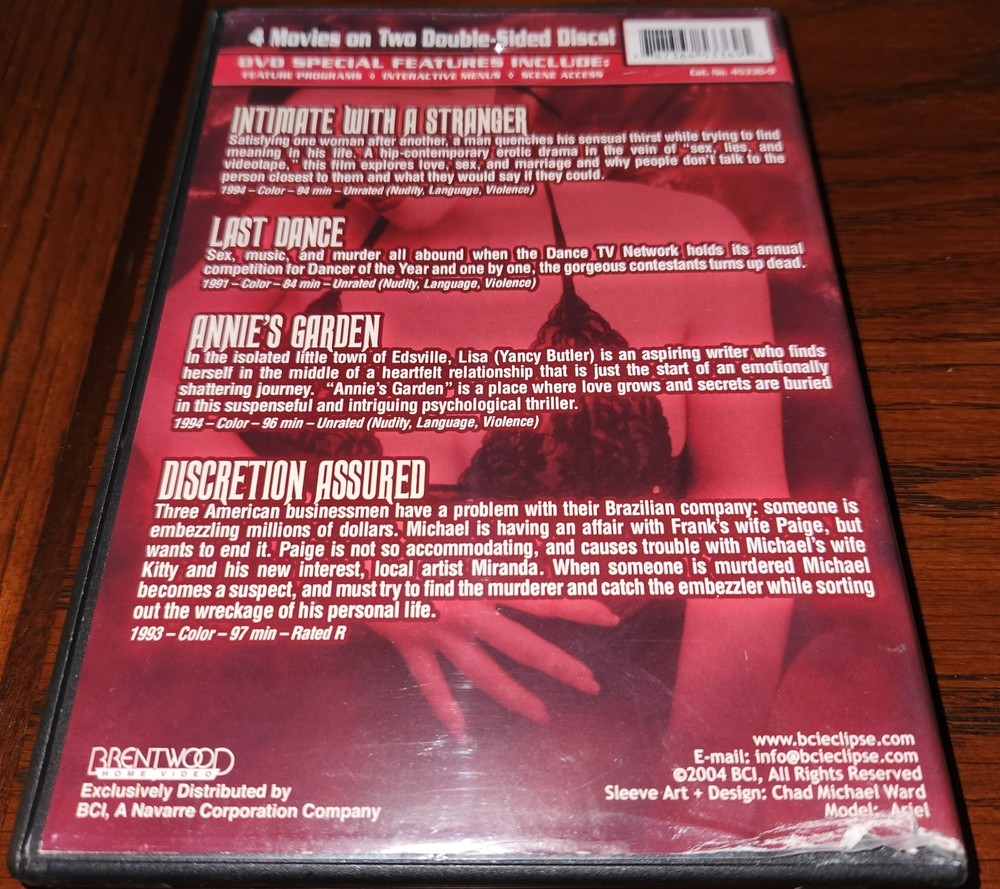 FREE SHIPPING ($4.63) Ships from USA. . This is the NO COUNTERFEITS ZONE... ORIGINAL COPYRIGHTED DVDs ONLY! CHECK MY FEEDBACK... BUY WITH CONFIDENCE. . Original inserts and pamphlets are included IF/WHEN PICTURED. My descriptions are mainly from INTERNET sources including those noted below. I also may include an AI description. (AI descriptions are often lame, but sometimes include some useful information.) Make a reasonable offer... if you don't "love" MY price! Cared for original from my personal collection plays properly... NOT a former rental. See back cover for more details. Photos shown are integral to the description. More description and full cast listing are available at IMDB.COM. For even more "sizzling"descriptions, see MrSkin.com and Ancensored.com. Also see my other listings... let's make a deal! . Elizabeth Gracen nude . FROM AI: The "Sexual Discretion - Four Movie Set" on DVD, released in 2004, features Yancy Butler in a gripping drama series. This R-rated collection includes four movies that delve into themes of intimacy and temptation, keeping viewers entertained with intense storytelling and compelling performances. With its provocative subject matter and engaging plotlines, this DVD set is sure to capture the attention of fans of dramatic and edgy movies.