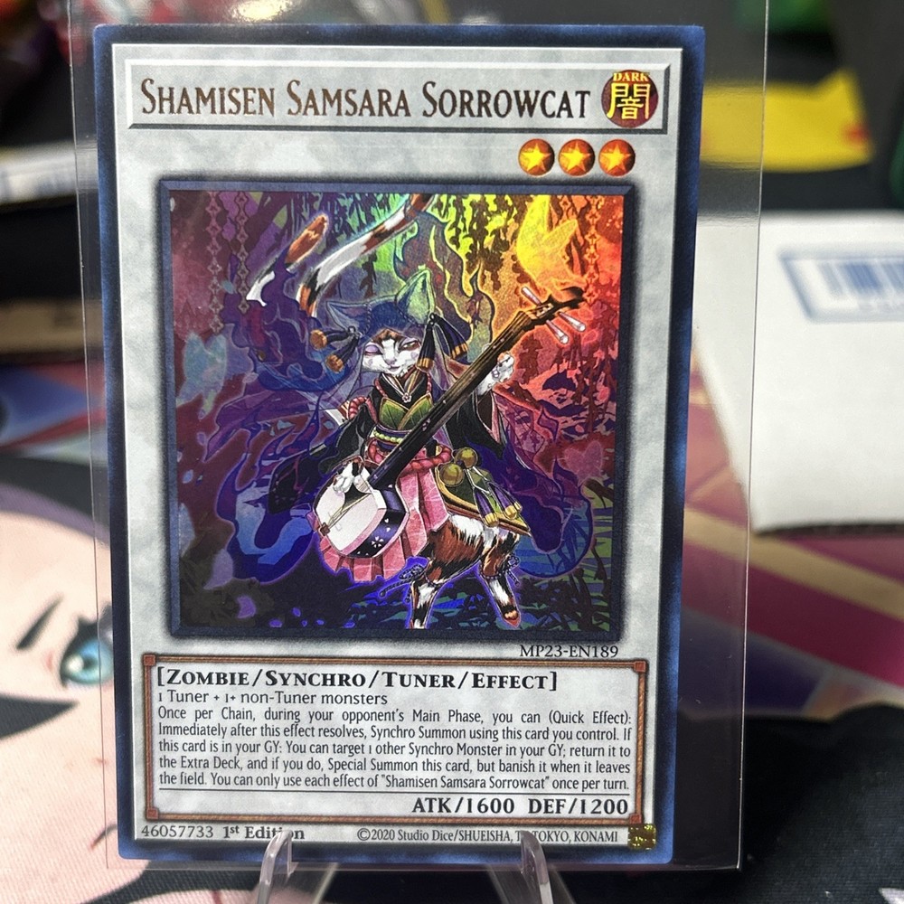 The "Shamisen Samsara Sorrowcat" card is an Ultra Rare, 1st Edition card from the Yu-Gi-Oh! TCG, specifically part of the 25th Anniversary Tin: Dueling Heroes Mega Pack set. This card is a Dark Attribute Zombie creature with 1600 Attack and 1200 Defense, making it a formidable addition to any deck. It is an Effect Tuner Synchro card, providing strategic gameplay options for players aged 6 and above. Created by Konami, this English-language card is printed on quality Card Stock and is a sought-after collectible for CCG enthusiasts. Personal Collection in Penny Sleeves, along with top loader, any questions, feel free to ask.