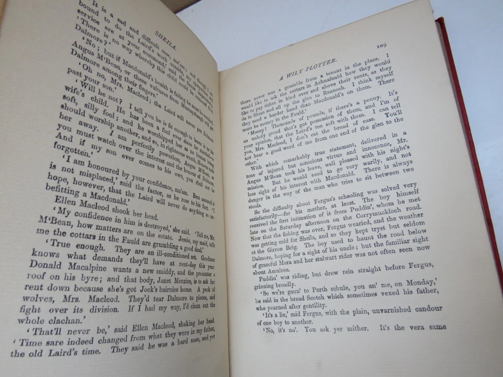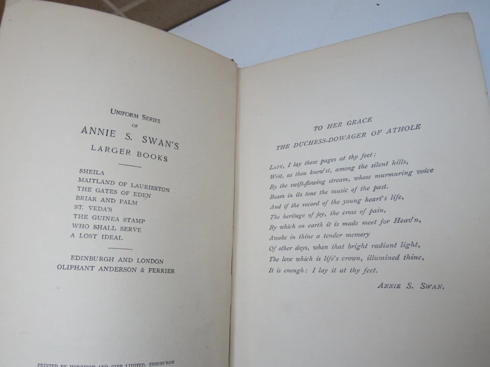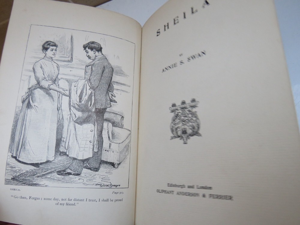For Sale - Sheila by Annie S. Swan, Oliphant Anderson & Ferrier Date - Undated Author - Annie S. Swan Publisher & Place - Oliphant Anderson & Ferrier, Edinburgh & London Pages - 379 Height of book - 19.7 cm Condition - Hardcover. Red decorated boards have mild edgewear and bumped corners. Front inside page has been clipped. Handwriting on inside page. Tanning and foxing to first few front and back pages and page edges but the rest remain clean.