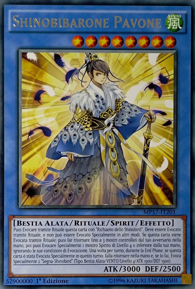 Shinobibarone Pavone - Rara - MP17-IT201 - Italiano - Near Mint Shinobibarone Pavone - Rara - MP17-IT201 - Italiano - Near Mint Puoi Evocare tramite Rituale questa carta con “Richiamo dello Shinobird”. Deve essere Evocato tramite Rituale, e non può essere Evocato Specialmente in altri modi. Se questa carta viene Evocata tramite Rituale: puoi far ritornare fino a 3 mostri controllati dal tuo avversario nella mano, poi puoi Evocare Specialmente 1 mostro Spirito di Livello 4 o inferiore dalla tua mano, ignorando le sue condizioni di Evocazione. Una volta per turno, durante la End Phase, se questa carta è stata Evocata Specialmente in questo turno: falla ritornare nella mano e, se lo fai, Evoca Specialmente 2 “Segna-Shinobird” (Tipo Bestia Alata/VENTO/Livello 4/ATK 1500/DEF 1500). Shipping Shipping cost: Italy Posta 1 -> 2,95 Corriere Espresso -> 5,99 Outside Italy Priority - 8,00 Delivery time: La Spedizione Viene Effettuata entro i 5 giorni successivi al pagamento dell'ordine. Payment Per qualsiasi info contattateci Service Per qualsiasi info contattateci
