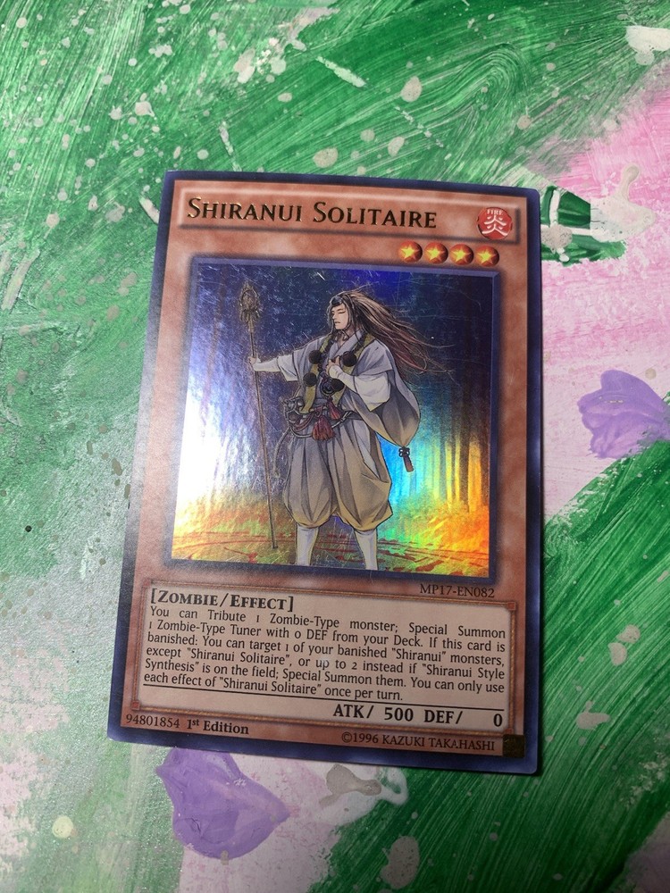 | Card Text | You can Tribute 1 Zombie-Type monster; Special Summon 1 Zombie-Type Tuner with 0 DEF from your Deck. If this card is banished: You can target 1 of your banished "Shiranui" monsters, except "Shiranui Solitaire", or up to 2 instead if "Shiranui Style Synthesis" is on the field; Special Summon them. You can only use each effect of "Shiranui Solitaire" once per turn. |