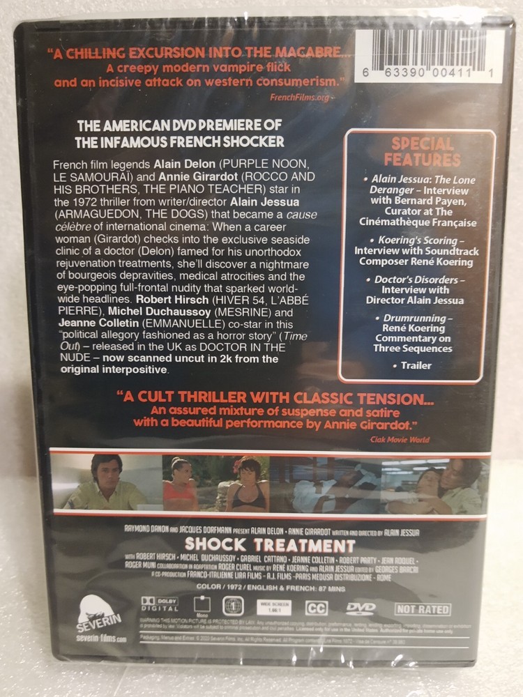 *NEW SEALED* Can Combine Shipping for DVDs/Books/CDs/Vinyl Albums. Only charge shipping for first item. Each additional item ships free. Just add the items to your cart and checkout; or request an invoice. Smoke & Pet Free Thanks for looking! 🎥🍿 Details..... Shock Treatment (French: Traitement de choc) is a 1973 psychological horror thriller film directed by Alain Jessua. It was released in the United Kingdom by distributor Antony Balch as Doctor in the Nude. French film legends Alain Delon (PURPLE NOON, LE SAMOURAÏ) and Annie Girardot (ROCCO AND HIS BROTHERS, THE PIANO TEACHER) star in the 1972 thriller from writer/director Alain Jessua (ARMAGUEDON, THE DOGS) that became a cause célèbre of international cinema: When a career woman (Girardot) checks into the exclusive seaside clinic of a doctor (Delon) famed for his unorthodox rejuvenation treatments, she’ll discover a nightmare of bourgeois depravities, medical atrocities and the eye-popping full-frontal nudity that sparked worldwide headlines. Robert Hirsch (HIVER 54, L'ABBÉ PIERRE), Michel Duchaussoy (MESRINE) and Jeanne Colletin (EMMANUELLE) co-star in this “political allegory fashioned as a horror story”(Time Out) – released in the UK as DOCTOR IN THE NUDE – now scanned uncut in 2k from the original interpositive. Special Features: Alain Jessua - The Lone Deranger: Interview with Bernard Payen, Curator at The Cinémathèque Française Koering's Scoring - Interview with Soundtrack Composer René Koering Director's Disorder - Interview with Director Alain Jessua Drumrunning - René Koering Commentary on Three Sequences Trailer Reversible Artwork Disc Specs: Aspect ratio: 1.66:1 Audio: English Mono Closed Captions / English Subtitles Region A Run time: 87 mins