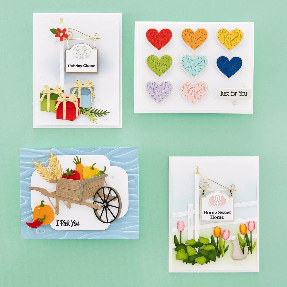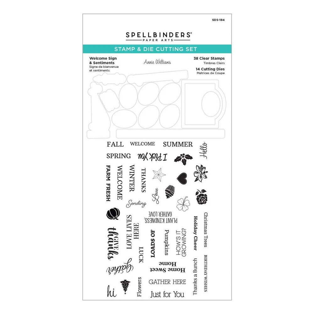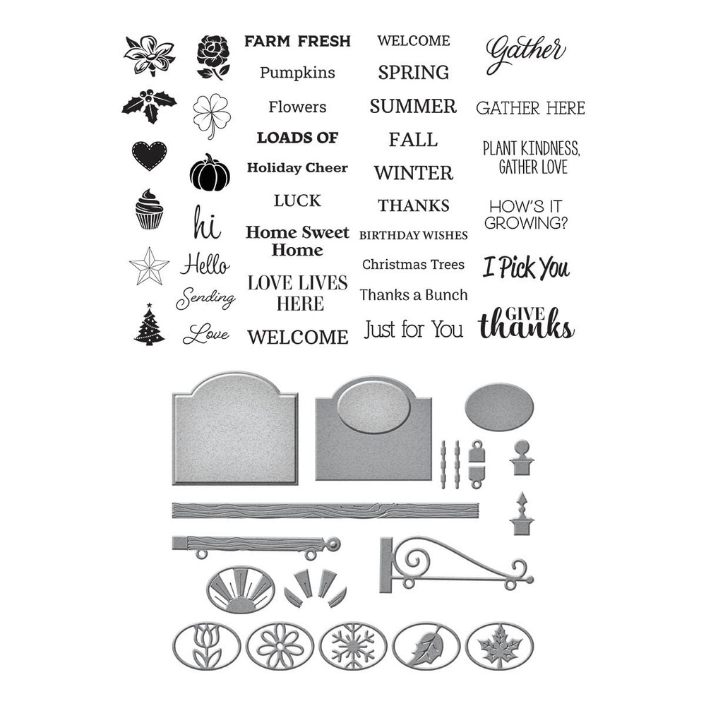 Welcome Sign & Sentiments Clear Stamp & Die Set is from the Country Road Collection designed by Annie Williams The 14 thin metal cutting dies and 38 clear stamps makes a combination of sign designs with a few that can land inside of a card. Die-cut a detailed sign with so many features that are hard to decide which one to create first! ' wafer thin etched dies are designed to cut cardstock, paper, metallic foil and other thin materials and can cut, emboss, and stencil with a single template Designed for the Platinum machines, but compatible in most die cutting machines Various Sizes from 0.06" x 10.62" to 3.86" x 0.20"