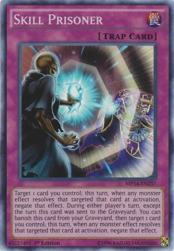 Skill Prisoner - MP14-EN237 - Super Rare - 1st Edition Image is a stock photo of the card. You will receive the card in Moderately Played condition Condition: Moderately Played ATK/DEF : Attribute : Trap Card Number : MP14-EN237 Card Rules : Card Text : Target 1 card you control; this turn, when any monster effect resolvesthat targeted that card at activation, negate that effect. During either player's turn, except the turn this card was sent to the Graveyard: You can banish this card from your Graveyard, then target 1 card you control; this turn, when any monster effect resolves that targeted that card at activation, negate that effect. Card Type : Normal Trap Card Edition : 1st Level : Monster Type : Trap Card Name : Skill Prisoner Passcode : 63227401 Pendulum Scale : Rarity : Super Rare Set : Mega Pack 2014 Be sure to visit our store for a wide selection of your favorite cards! We are running specials RIGHT NOW!! Shipping Options: ~Ships in a regular white envelope with a stamp for FREE! (THERE IS NO TRACKING INFORMATION AVAILABLE FOR THE ABOVE METHOD. SHIPPING TIME IS 4-10 BUSINESS DAYS) ~Ships in a TRACKEDbubble mailer for $5.99! ~Shipments are handled same or next business day. ~FREE SHIPPING for each additional card, so shop around our store!