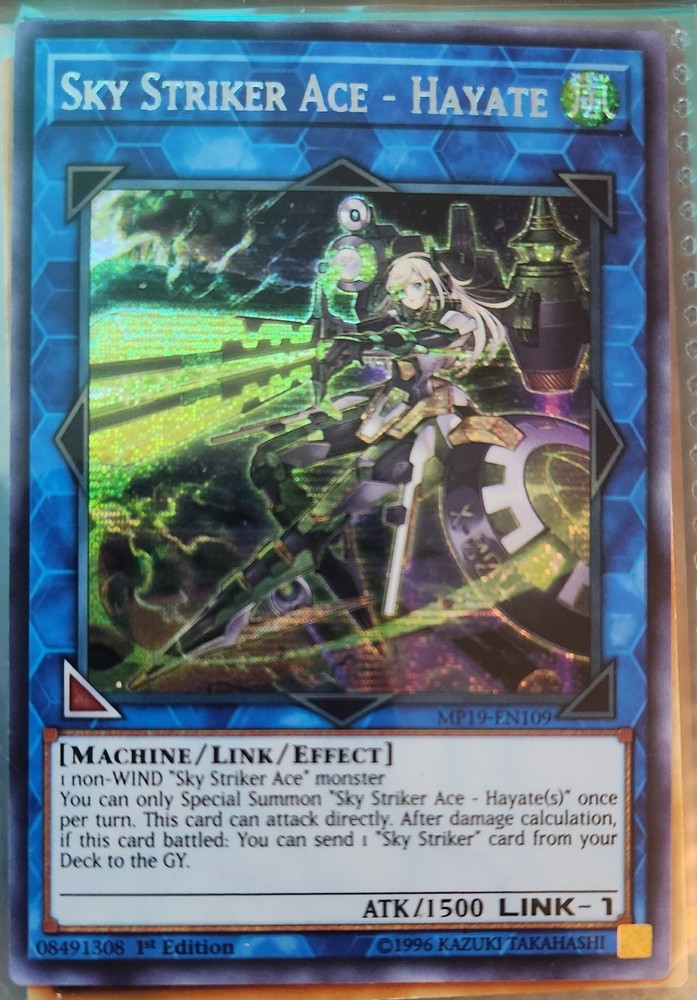 Elevate your Yu-Gi-Oh! TCG collection with the Sky Striker Ace - Hayate card from the 2019 Gold Sarcophagus Tin Mega Pack. As a Prismatic Secret Rare, this card stands out with its distinct rainbow holographic foil that shines in the light. Its attributes include a powerful 1500 attack, and it can attack directly, dealing additional damage to your opponent's life total. The card's text allows for a unique playstyle: after calculating damage, if the Sky Striker Ace - Hayate has battled, you can send a "Sky Striker" card from your deck to the graveyard, making it a strategic addition to your deck. With card number MP19-EN109, this English-language Effect and Link card is a must-have for both serious players and collectors.