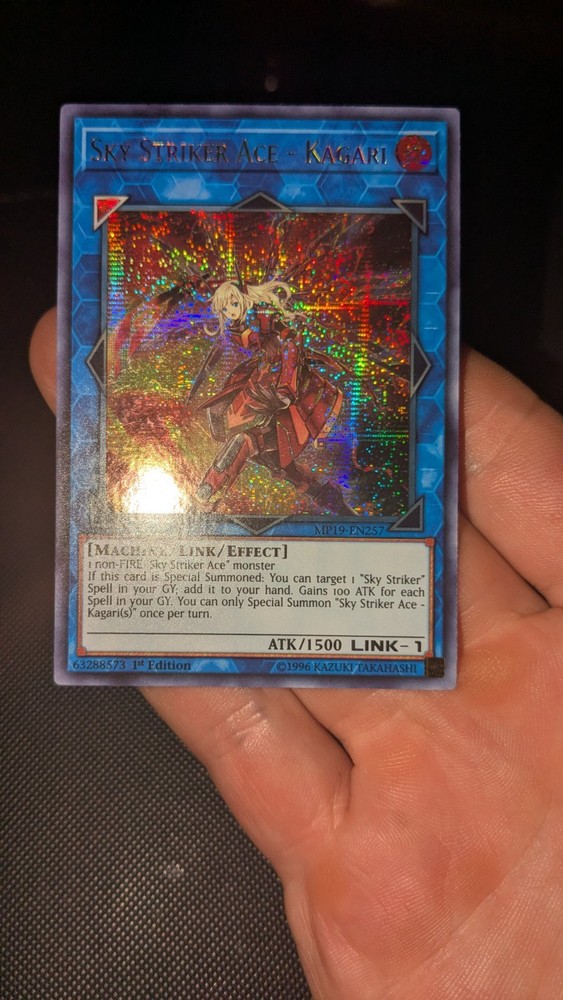 This Sky Striker Ace Kagari from the 2019 Gold Sarcophagus Tin is an absolute gem for Yu-Gi-Oh! fans. The fiery 1500 ATK monster not only looks amazing but also adds serious power to Sky Striker decks. As a 1st Edition, it’s extra rare and perfect for collectors or competitive players. The gold foil and artwork make it stand out, and its in-game effects are clutch for strategy. A must-have for anyone who loves the archetype!