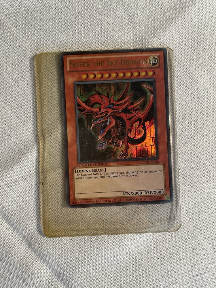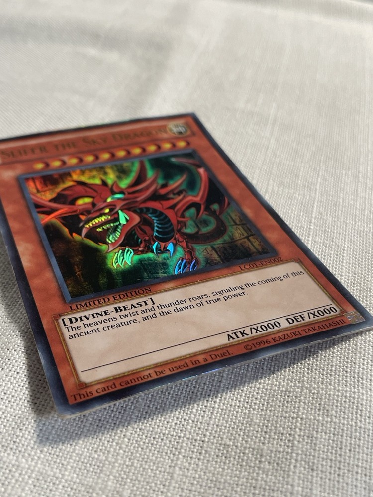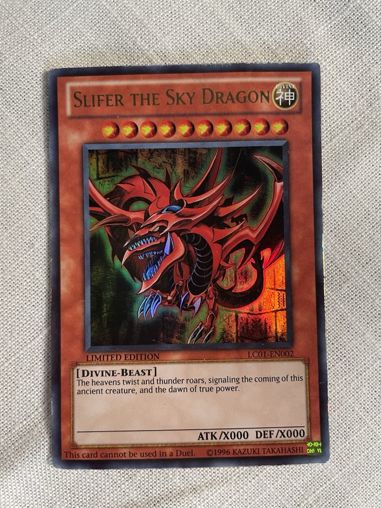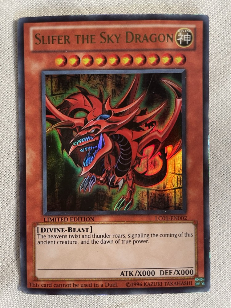 The card shown is "Slifer the Sky Dragon" from the Yu-Gi-Oh! Trading Card Game. It is a monster card of the Divine-Beast type and is a limited edition, ultra-rare holo foil card with the code LC01-EN002. Key details include: Name: Slifer the Sky Dragon, also known as Sky Dragon of Osiris. Type: Divine-Beast. Rarity: Ultra Rare Holo. Edition: Limited Edition. Attack/Defense: ATK/X000 DEF/X000 (gains 1000 ATK/DEF for each card in the player's hand). Effect: When an opponent summons a monster, Slifer attacks and weakens its power. Limitation: This card cannot be used in a Duel. Origin: Created by Kazuki Takahashi in 1996.