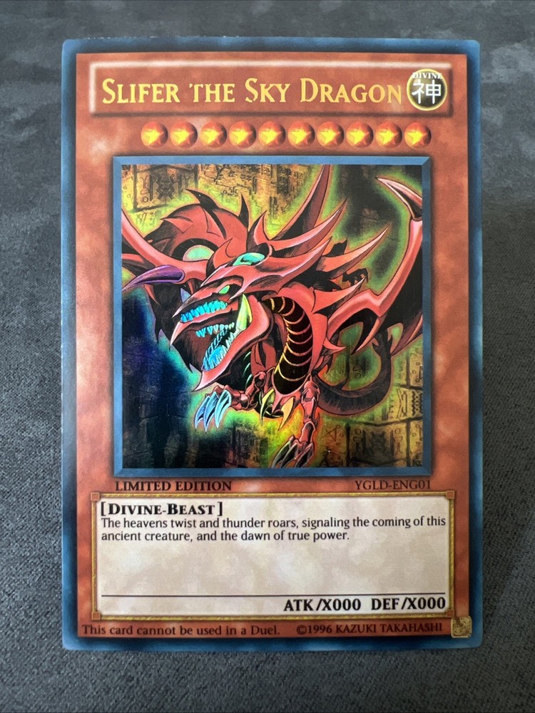 Slifer the Sky Dragon YGLD-ENG01 Limited Edition is an ultra rare collectible card from the Yu-Gi-Oh! TCG set "King of Games: Yugi's Legendary Decks." Manufactured by Konami, this divine-beast card features a defense/toughness of 0 and an attack/power of 0. With its limited edition status and unique design, this normal card is highly sought after by collectors for its rarity and significance in the game.