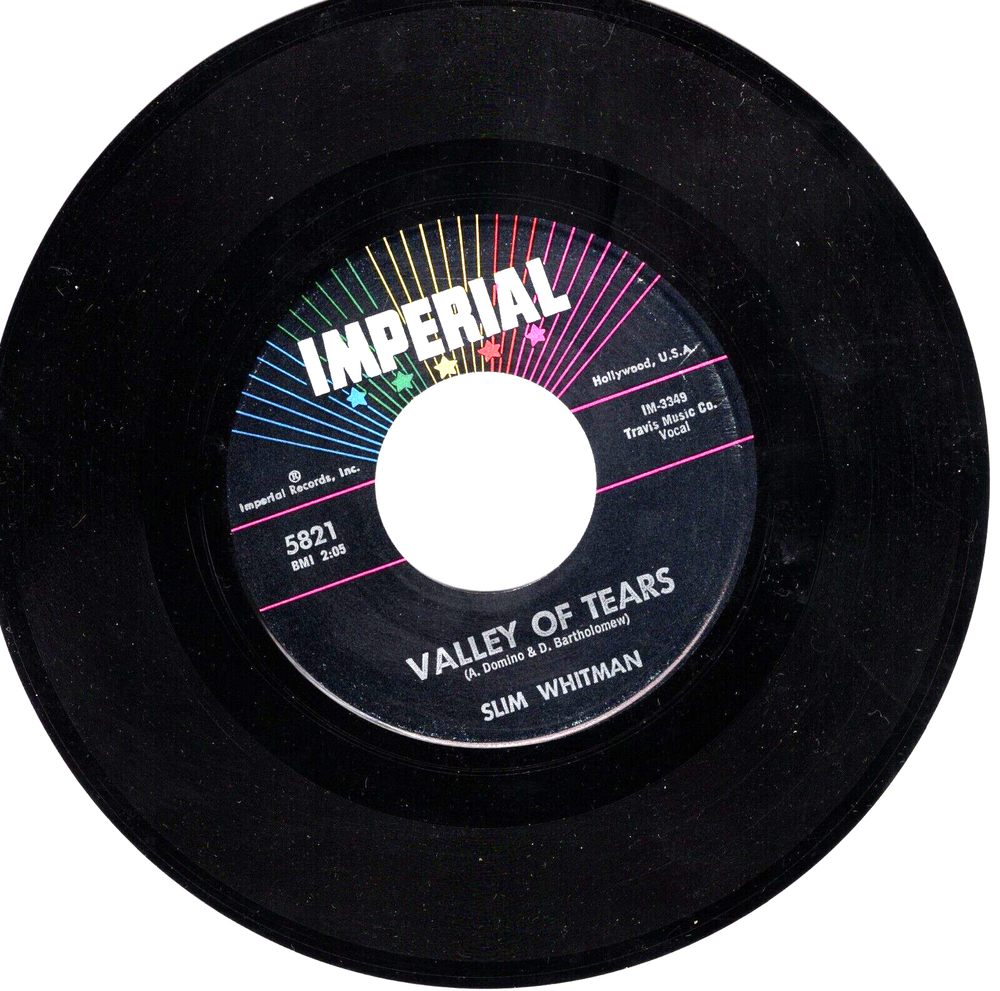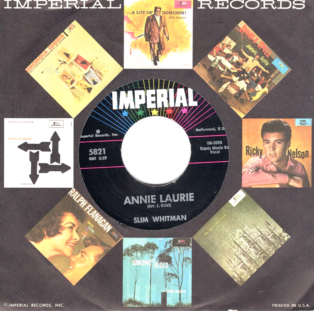 The Original Hits .. 45 R.P.M. Records .. Ships USPS: .. Delivery ConfIrmation.... ALL RECORDS HAVE BEEN STORED IN SLEEVES, AND IN CONDITION AS LISTED... Professional Packing, We Ship In New Boxes Marked .. FRAGILE.. With Cardboard Packing.. Records Guaranteed to be as listed... See Photo Of Label For any Tags Or Writing On Label.. " STANDARD GRADE CODES.." M .. NEW .. M- .. CLOSE TO MINT.. VG+ .. CLEAN RECORD IN GREAT CONDITION .. VG .. RECORD SHOWS SOME WARE.. VG- .. RECORD HAS SOME SCRATCHES PLAYS OK.. G .. POOR CONDITION WILL PLAY.. All 45's are long out of print, and becoming more scarce every year. The records gain value, and now is the time to add to your collection. We have been selling on ebay over 23 Years.. 100% Guarantee On All Records... This 7" vinyl single by Slim Whitman features the songs "Annie Laurie" and "Valley of Tears". It is a first pressing from the 1950s, with a record grading of Mint (M) and a sleeve grading of Very Good Plus (VG+). The case type is a paper sleeve and the format is vinyl. The record label is Imperial and the release title is "Annie Laurie / Valley of Tears". This single is perfect for collectors of country pop music from the 1950s.