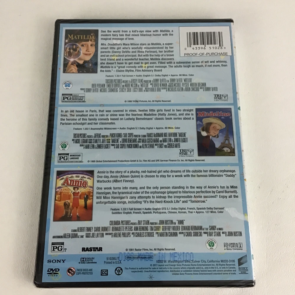 IN NEW SEALED CONDITION FROM: SONY RELEASED IN: 2017 SERIES: MATILDA, ANNIE, MADELINE INCLUDES: TRIPLE FEATURE DVD RATED: PG THANKS FOR LOOKING PLEASE EMAIL WITH ANY QUESTIONS!!...