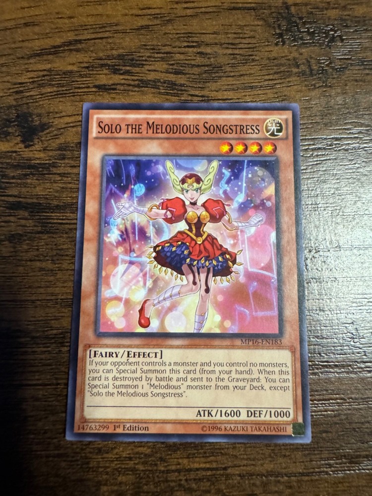 This Yu-Gi-Oh! TCG card is a must-have for collectors and players alike. With an Attack/Power of 1600 and Defense/Toughness of 1000, Solo the Melodious Songstress is a Common/Short Print card from the 2016 Mega-Tins Mega Pack set. The card features an Effect type and is in English language from the manufacturer Konami. It also has a 1st Edition feature, making it a rare find. The card number is MP16-EN183 and it belongs to the CCG Individual Cards and Collectible Card Games categories, under Toys & Hobbies.