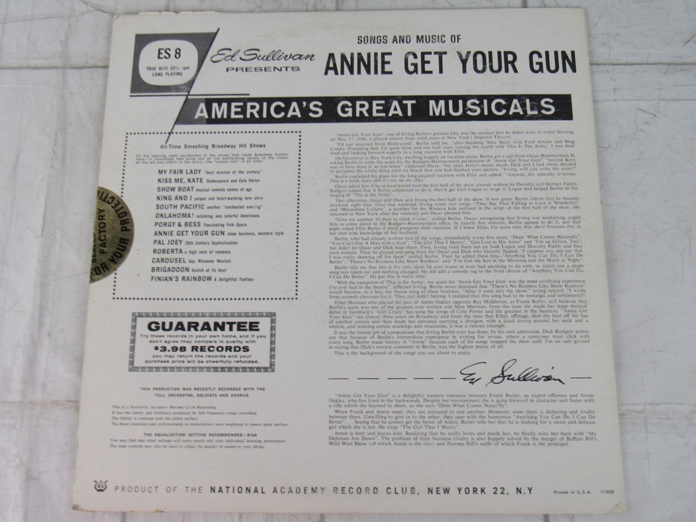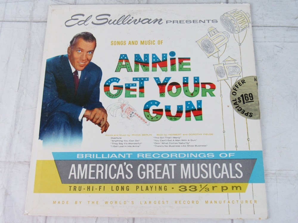 You are buying a Songs and Music of Annie Get Your Gun, Vinyl Records LP There is wear on the cardboard sleeve. PAYMENT: We accept all forms of payment that eBay will allow. SHIPPING TIME: We ship all items within 1 business day of your payment clearing. (Excluding holidays and weekends) RETURNS: We accept ANY item back within 30 days of the original purchase date for a full refund. All returns must come back in the same condition they were shipped out and arrived in. FEEDBACK: We aim to earn positive 5 star feedback for every item. If your happy with your purchase please take a minute to leave positive 5 star feedback. If you have any issues with your purchase please contact us directly using Ebays Message service to resolve the issue so that we can earn your positive 5 star feedback.