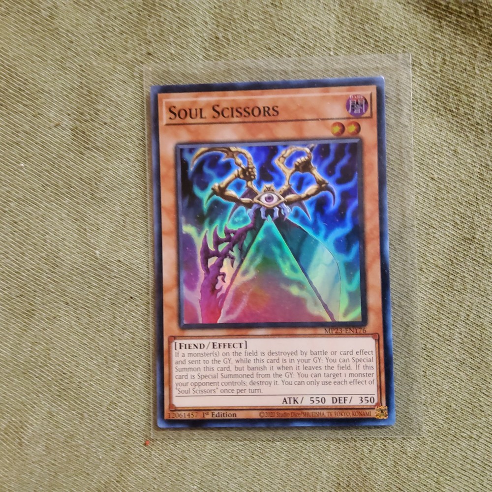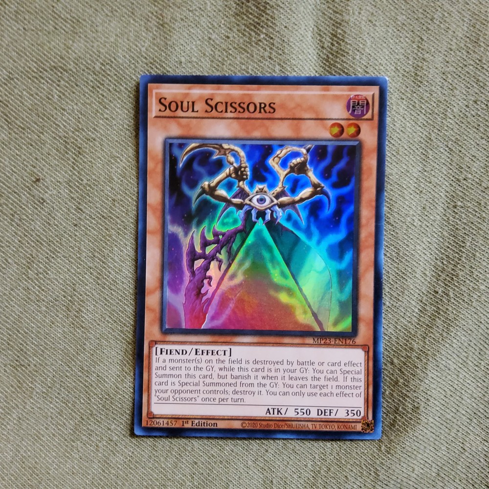 Level up your Yu-Gi-Oh! TCG collection with the Soul Scissors card, a formidable addition from the 25th Anniversary Tin: Dueling Heroes Mega Pack. As an Effect-type card with a card number of MP23-EN176, it's a must-have for players and collectors alike. Its impressive attack power of 550 and defense toughness of 350 make it a force to be reckoned with in the dueling arena. This Super Rare card features the Fiend creature/monster type and comes in the English language, ensuring it's ready for both play and display. Proudly manufactured by Konami, Soul Scissors stands out with its 1st Edition status, a valuable find for those looking to enhance their game or collection with a touch of darkness.