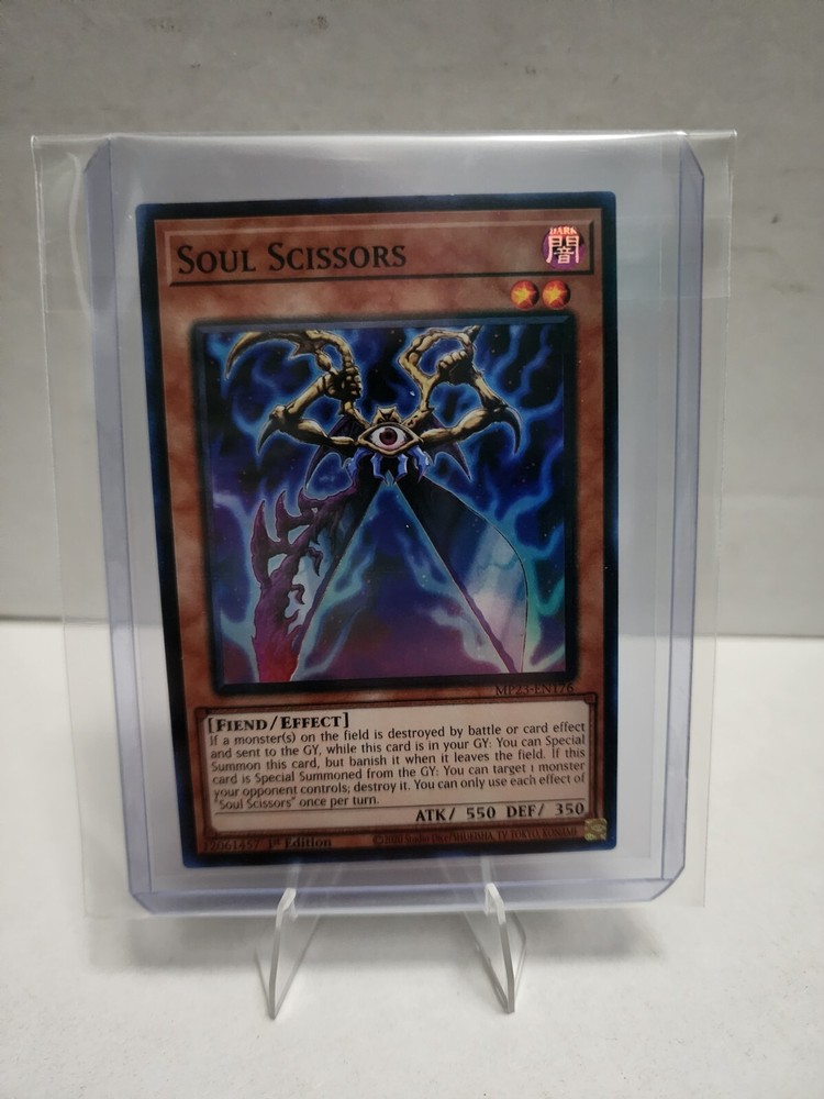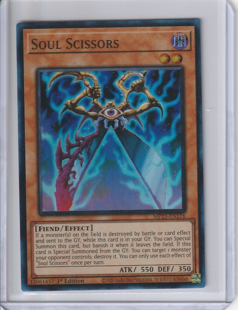 The "Soul Scissors" card is a Dark Fiend creature with 550 Attack and 350 Defense points. It is a Super Rare 1st Edition Effect card from the Yu-Gi-Oh! TCG, part of the 25th Anniversary Tin: Dueling Heroes Mega Pack. The card is made of Card Stock and is in Standard size. It is in English and manufactured by Konami in the United States. Personal Collection in Penny Sleeves, along with top loader, any questions, feel free to ask.