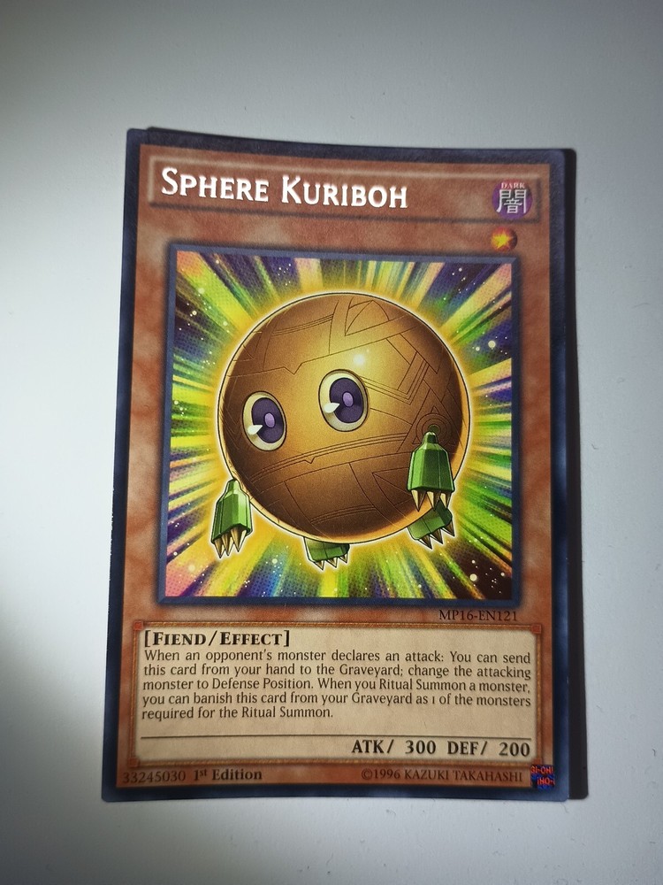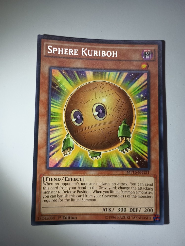 Enhance your Yu-Gi-Oh! TCG collection with the rare and powerful Sphere Kuriboh from the 2016 Mega-Tins Mega Pack. This Effect-type Fiend monster boasts an attack power of 300 and a defense strength of 200, making it a formidable addition to any deck. This 1st Edition card is in English and has the card number MP16-EN121. It was manufactured by Konami and is part of the Dark attribute set. Add Sphere Kuriboh to your collection and dominate your opponents in your next game.