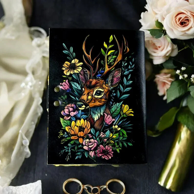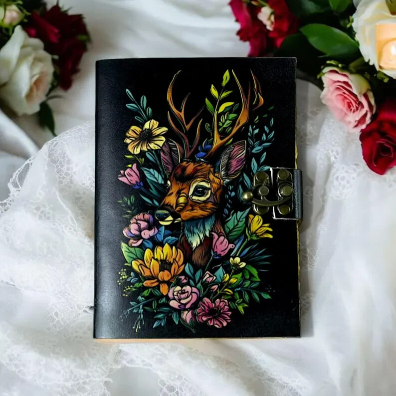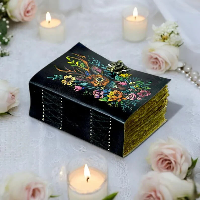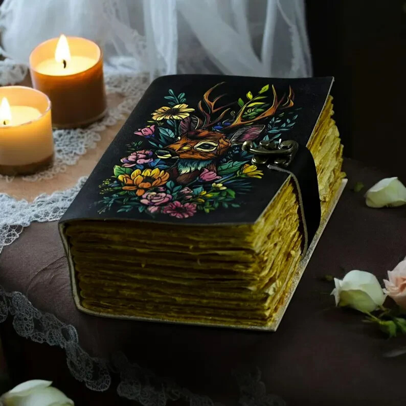 400 Page Large Grimoire Leather journal Deer Journal, Blank spell book Book of shadows Leather Celestial Gifts For Him Her * Print - deer journal * Brass C Clasp lock closure * Genuine buffalo leather * Vintage deckle edge old paper *handmade rustic cotton paper * 200 Sheets (400 pages both sides) * Availability in multiple sizes - 7x5 inches 8x6 inches 10x7 inches 13x10 inches 200 pages is also available in this journal perfect gifts for him and her ●Leather journal witchcraft Book of shadows notebook is made with 400 pages of Antique Paper which looks like it was pulled from history. You will fall in love with the antique handmade cotton paper which is unique to our Vintage journal Notebook. ● The vintage clasp lock will keep all your valuable writing locked inside.Sturdy hand stitched binding to make sure that no paper comes out loose from your spell notebook. ● The witchcraft supplies journal is printed with a special “Tree of life” which helps to reveal inner truth within yourself and encourage self-awareness and self expression. We have taken extra to make sure that the emboss is perfect in every piece. ● Sketch, Doodle, Write on your Leather Blank Spell Journal with a Calligraphy Pen Fountain Pen, Brush Pen, Ball Pen, Acrylic Colors, Watercolor and many more. We guarantee no bleed through. ● Can be used as a notepad, journal, writing notebook, sketch book. 1.25 inch thickness, easy for handwriting, drawing or sketching and compact for carrying in your bag. Ideal for alternatives ● Artist Sketchbooks, Photo Album, Traveling Notes, Business Executive, Logbook, Poetry Work, Journalists, Food Planner, Instagram Scrapbook and Bible Journaling. ● Best Gift For Your Companion: A Journal Is Like A Trusted Friend. You Can Use It To Solve Queries, Get Inventive, Or Record Valuable Memories For Them To Last Forever Or You Can Just Use It As A Gift For Your Wife, Son, Or A Daughter Or For Some Enthusiastic Writer In Your Family. Even For Looking For A Miraculous Spell Book Or A D&D Gamer Looking For His Quest Book. ● Perfectly Sized For Multi-Purpose Use: Length 5", Width 1", Height 7" Inches, This Easy To Carry Personal Diary Is Perfect To Use As A Health Journal, Sketchbook, And Poetry Journal. It's An Ideal Journal Which Records Your Daily Thoughts And Life Lists. And Also Good For Designing, Doodling, Or Calligraphy Of Your Choice. PERFECT FOR ALL YOUR DAILY WRITING AND DRAWING NEEDS -- Junk Journal -- Dungeons and Dragons Journal -DND -- Mothers Day Gift -- Nature journaling -- Instagram photobook or scrapbook -- Teen journal or girls' diary -- Travel diary -- Weight Watchers Records -- New baby records or journal -- Letters to your loved ones -- Letters to give to your children when they grow up -- Daily Notepad or Bullet Journal -- Scheduling and appointment reminders -- Life moments tracker -- Vacation scrapbook -- Story writing -- Notebook to write in