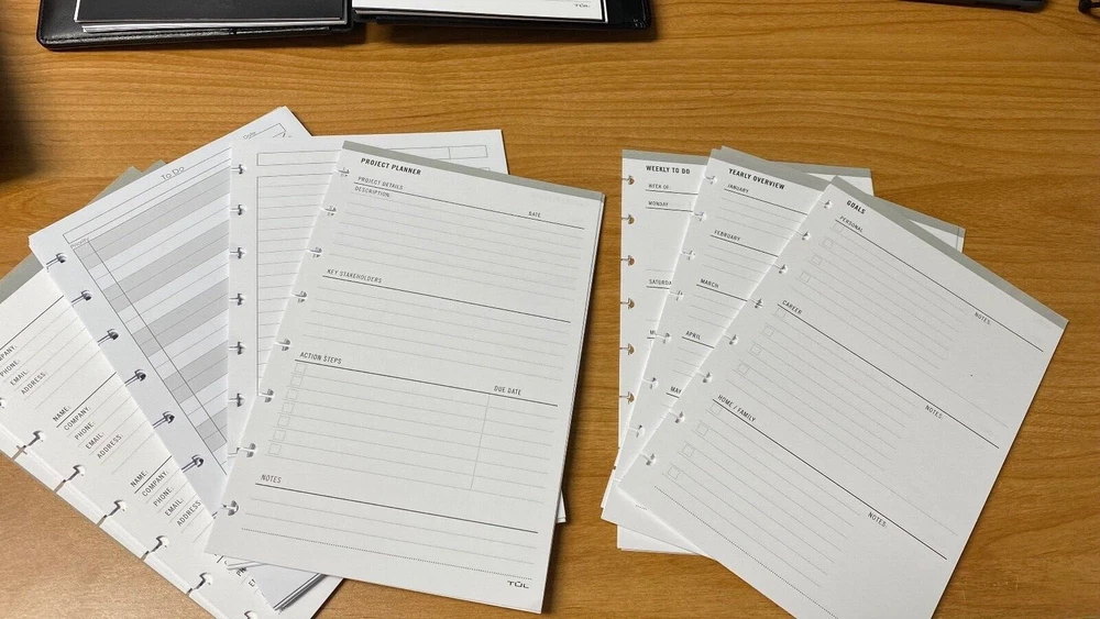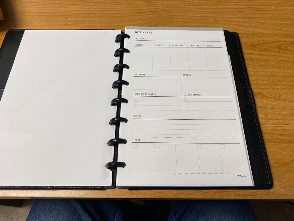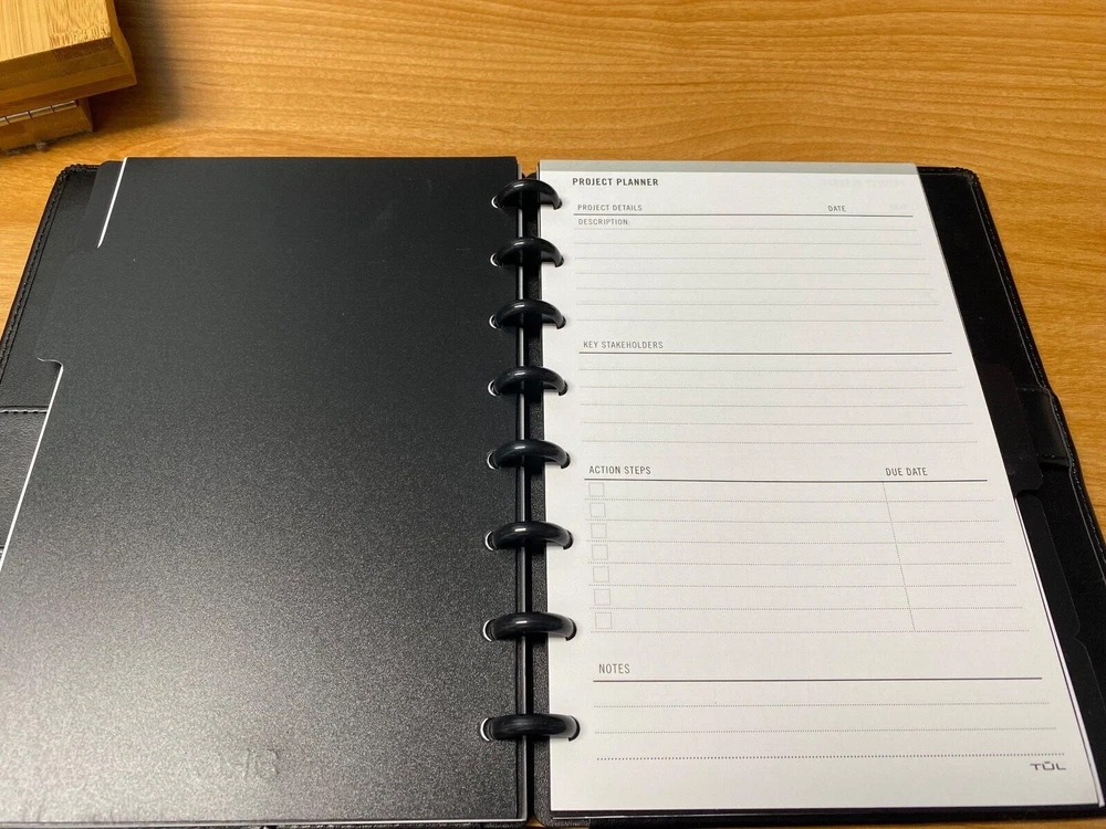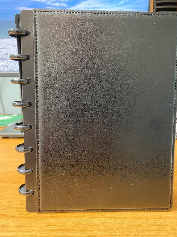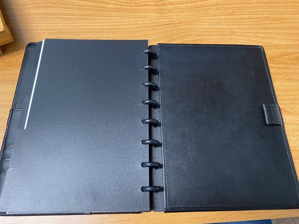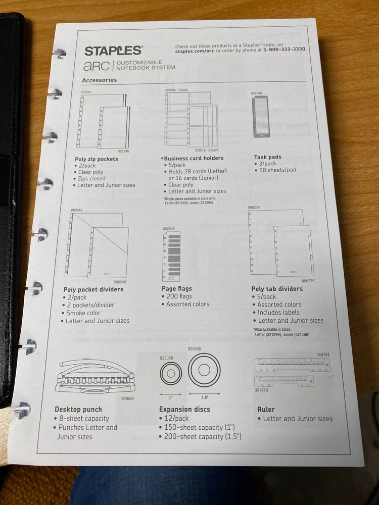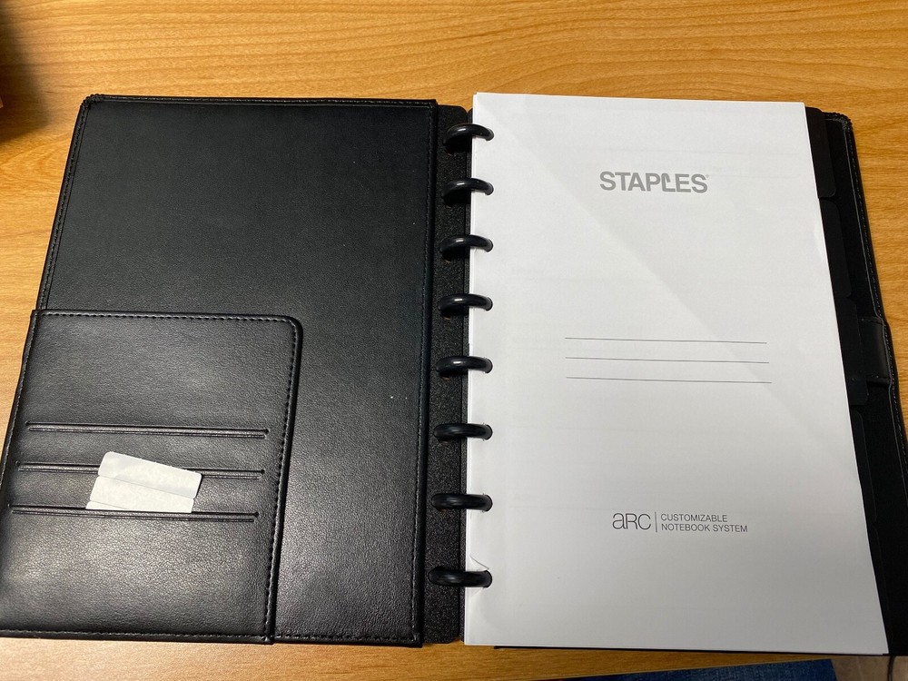 Staples ARC disc-bound notebook, 6 3/4 x 8 3/4 size. This comes with five black dividers and several types of paper. Paper includes - Lined Paper; To-Do List; Weekly To-Do (Undated); Yearly Review (Undated); Goals Planner; Project Planner; Contacts.Notebook is lightly used, still looks like new.
