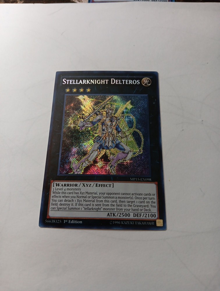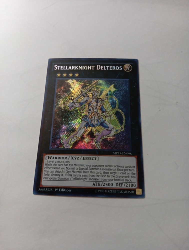 Stellarknight Delteros is a Warrior-type Xyz Effect monster card from the 2015 Mega-Tins Mega Pack series in English. Manufactured by Konami, this Secret Rare card has 2500 Attack and 2100 Defense. It is part of the Yu-Gi-Oh! TCG and is numbered MP15-EN098.